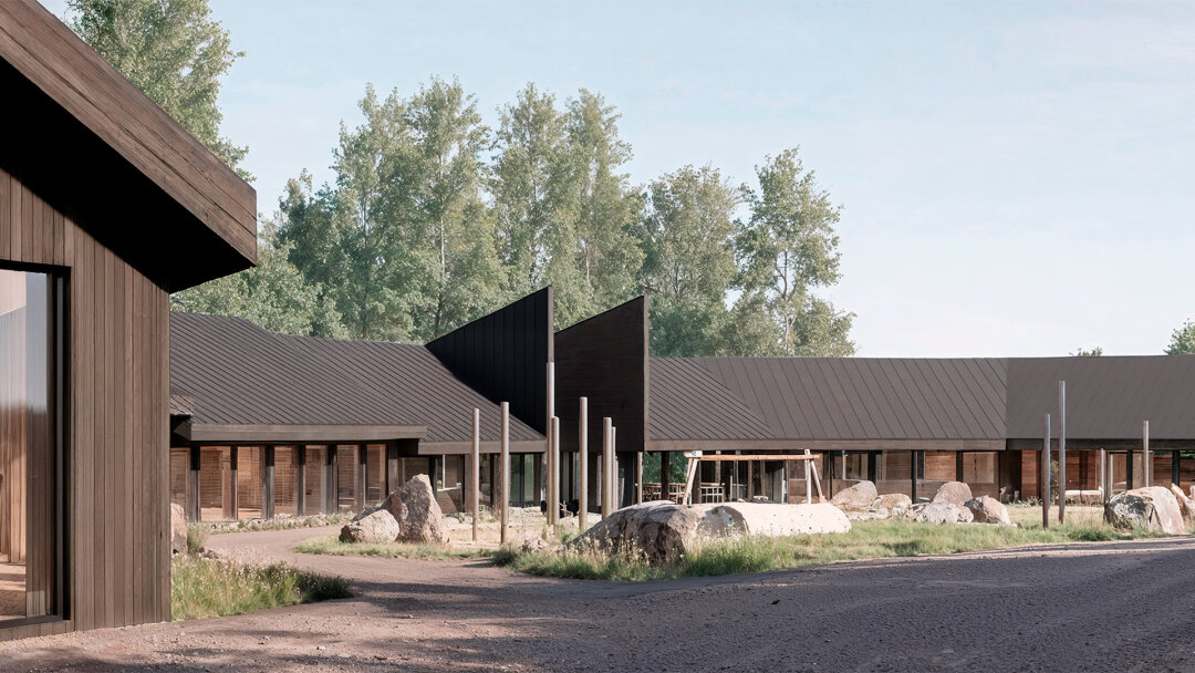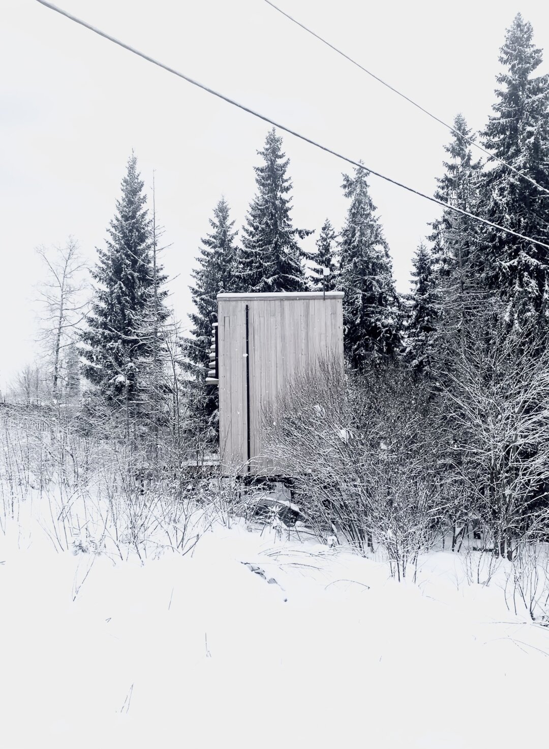 Жилой дом архитекторы Маша и Женя спроектировали для себя. Концепция вдохновлена скандинавской архитектурой, в частности, норвежским отелем Juvet Landscape, и северными ландшафтами: лесами, болотами, валунами и Ладожским озером. В основе лежат два основных объема — одноэтажный жилой блок и двухэтажная мастерская. Между ними расположена терраса с порталом-дровницей и небольшой сауной. Постройки подняли на ножки, чтобы минимизировать воздействие на окружающую среду, а кровлю озеленили.