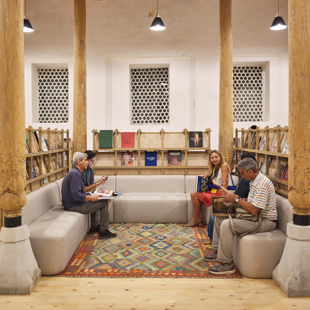 Поп-ап библиотеку в отреставрированном здании бывшей мечети Поччокул Ходжа XIX века архитекторы спроектировали в рамках Бухарской биеннале искусства. «В основу концепции лег образ топчана — традиционного центра двора и символа общения. Пространство построено вокруг общего ядра, отсылая к культуре медресе: здесь размещаются места для работы и чтения. Дизайн был направлен на то, чтобы соблюсти духовный и пространственный характер здания и привнести в этот район новую социальную функцию», — отмечает команда архитектурного бюро ludi_architects. В оформлении интерьера использовали преимущественно простые формы и теплые материалы: мебель из натурального дерева и ткани, изготовленную местными мастерами. Цвет лака старались максимально приблизить к историческим элементам здания, чтобы органично вписать предметы в пространство. Помещение при необходимости можно легко трансформировать под мастер-классы, лекции, кинопоказы.