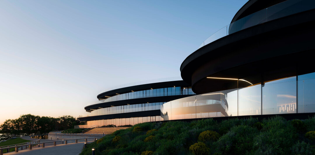 Учебно-тренировочная база футбольного клуба «Краснодар», напоминающая лайнер, расположена в Адыгее. Комплекс состоит из трех разноэтажных блоков: в первом — гостиница, во втором — спа, в третьем — спортивная часть. Каждый следующий этаж меньше предыдущего, за счет чего архитекторам удалось добиться динамичного облика сооружения. Корпуса стоят таким образом, что из внутренних помещений открывается вид на водоем и лес. Каскад террас и ступеней будто стекает по береговому склону, за счет чего здание удалось органично вписать в ландшафт.