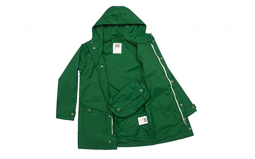 Бренд Андрея Кравцова не имеет логотипов города на вещах, но благодаря ассортименту напрямую ассоциируются с Петербургом. SH’U выпускают дождевики (в том числе и в детских размерах), непромокаемые куртки, тренчкоты и рюкзаки всех цветов, а в наступающем сезоне запустят линейку с резиновыми сапогами.