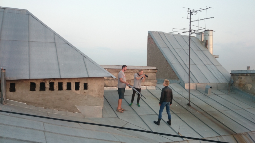 На вечер запланировано настоящее приключение. Чемпиона мира по танцам в аэротрубе Леонида Волкова Юсси захотел снимать на крыше на фоне заката и ночных огней. Забраться на крышу с самым живописным видом в Петербурге помогли ребята из «Крышконтроля», которые водят экскурсии над городом. Оказалось, в юности Юсси тоже был руфером, и в мгновение ока с огороженного пятачка, где планировалось проводить съемку, бесстрашно полез дальше по крыше в поисках лучшей панорамы – хотя куда уж лучше?