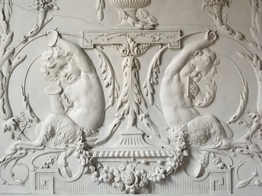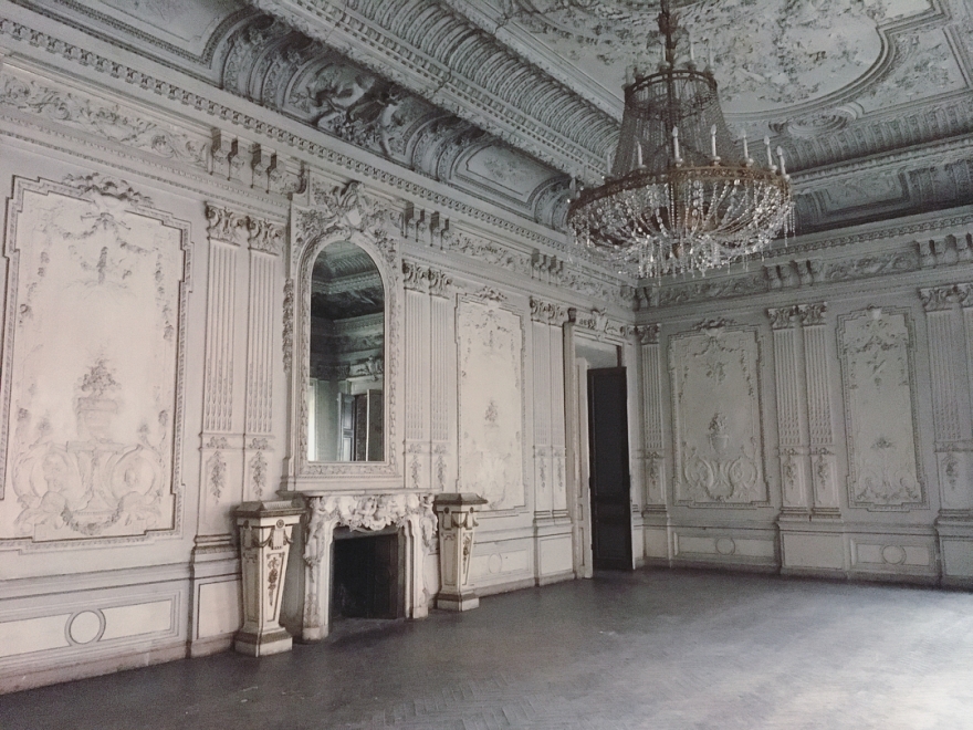 Танцевальный или Белый зал выполнен в стиле Людовика XV. Двухярусная падуга образует плавный переход от стен к плафону, скругляя углы и придавая комнате воздушность и пластичность. Стены, двери и потолки обильно украшены лепниной с растительными орнаментами и мифическими мотивами — тут воедино сплелись цветочные венки, целующиеся путти и сатиры с музыкальными инструментами. В раме над камином сохранилось подлинное зеркало, в котором отражается массивная люстра с хрустальными подвесками. К Белому залу примыкает курительная комната в мавританском стиле — по моде того времени. Стены украшены мелкой вязью, а под потолком висит старинная люстра из стекла и латуни.