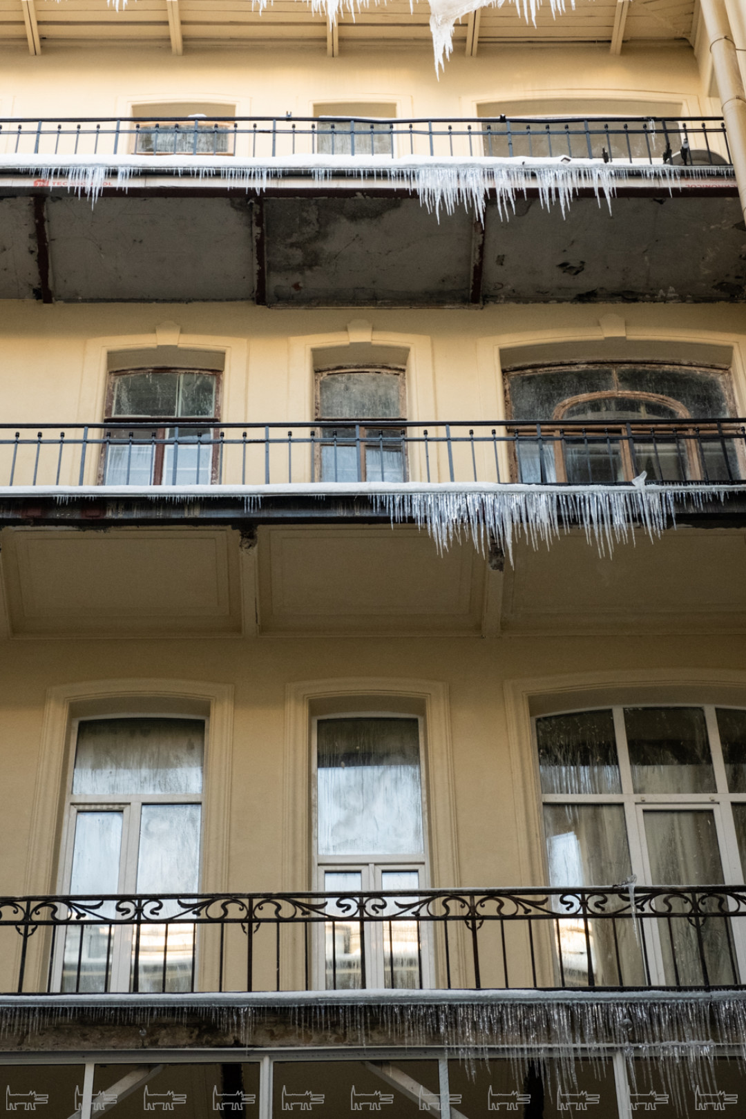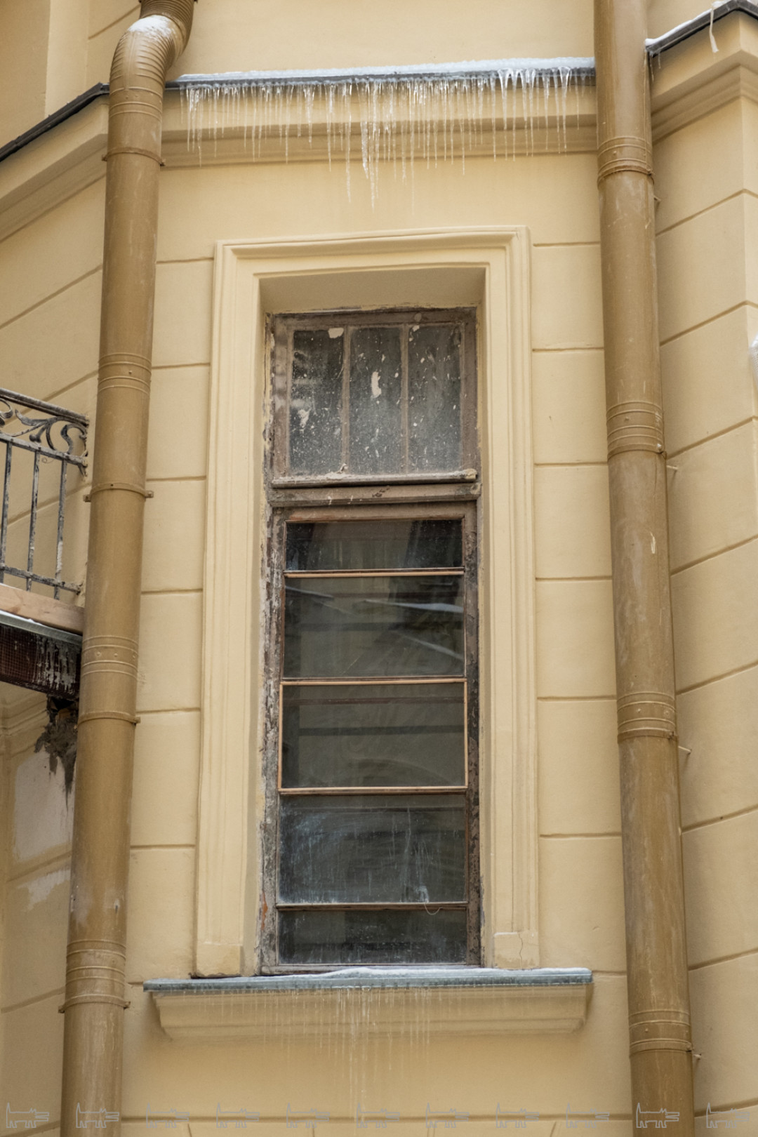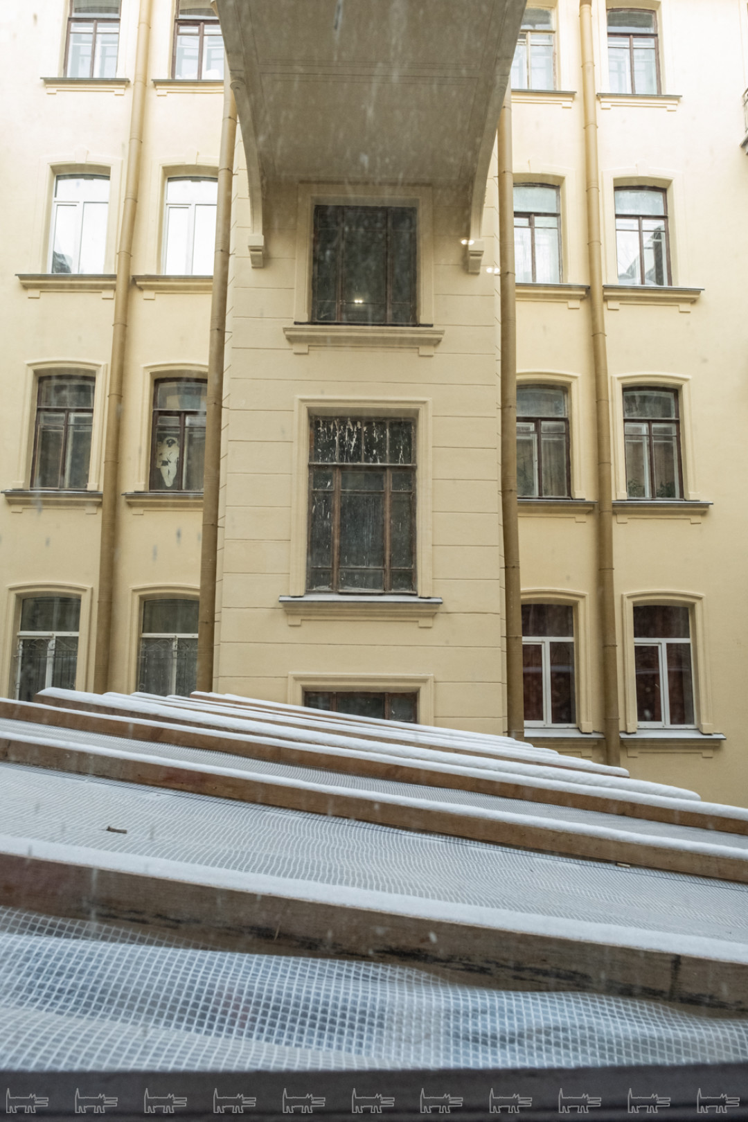Мы, наверное, далеко не все можем увидеть, но где-то начиная с октября нарушения были по всем фронтам. Козырьки еще не вернули, весь лицевой фасад красили в декабре и январе при минусовой температуре – мы очень боимся, что все это сразу посыпется. Штукатурку наносили прямо на ржавые детали, у нас есть огромный фотобанк – хоть выставку делай. На краске образовался иней – дом покрылся пятнами, как ягуар, если присмотреться, вообще нигде нет ни одного ровного места, все криво-косо. Металлодекор так и не забрали на реставрацию – чернорабочие чистят его корщетками и «Уайт-спирит» и красят. КГИОП не отвечает на наше письмо с декабря.