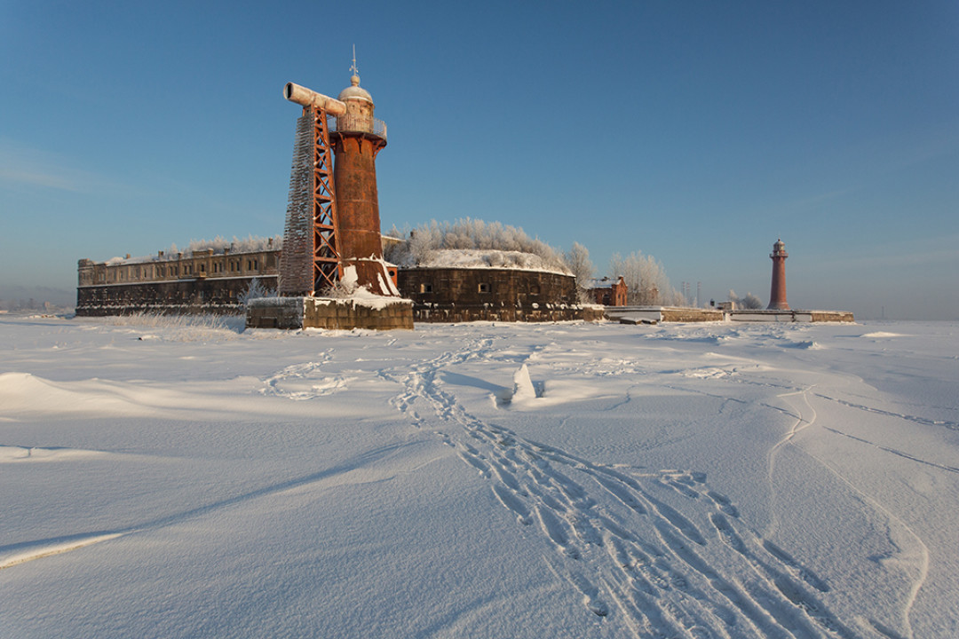 Маяк, расположенный на искусственном островке в районе Большого Кронштадтского рейда. Построен в 1914 году из нового для того времени материала – бетона. Недавно отметивший свое столетие маяк исправно работает до сих пор – автономно, без смотрителя, электропитание современной светодиодной лампы осуществляется от аккумуляторов, заряжаемых солнечными батареями.