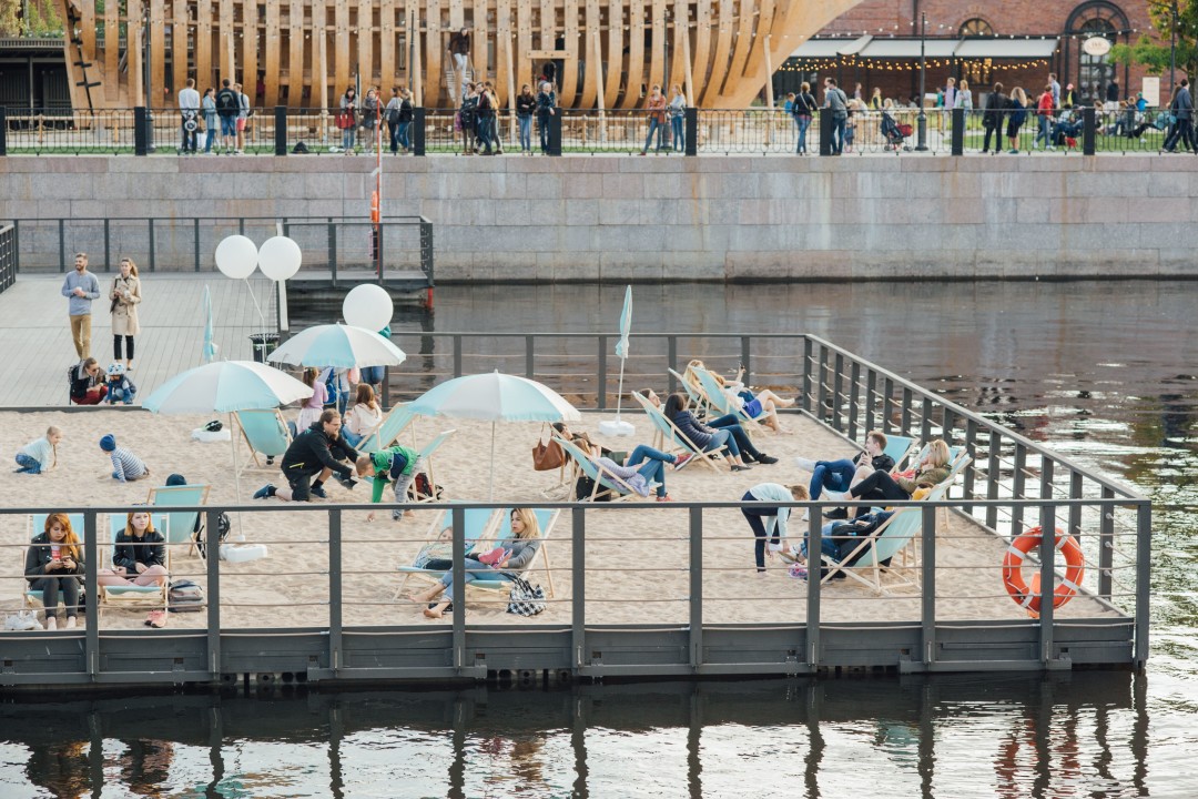 Настоящий песчаный пляж вернется с новыми комфортными шезлонгами, большими зонтиками, душем, кабинками для переодевания и следящим за порядком спасателем на вышке – как в Малибу.