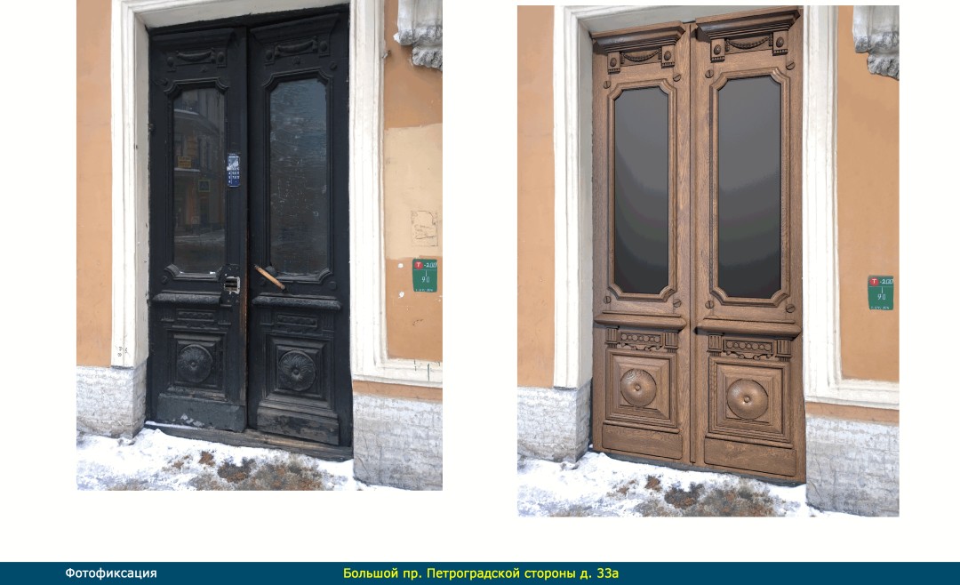 В начале прошлой недели пропали двери с двух домов №63 и №33А. «Обе дубовые с резьбой, в стиле Ренессанс. Можно представить, каково было людям, прожившим в доме много лет, и ценящим его красоту, увидеть, что прекрасная старинная дверь снята. Объявления, в которых собственников предупреждали о предстоящей замене дверей, были вывешены только на следующий день после установки новой. То есть воспротивиться этому безобразию возможности уже не было», — рассказала историк мебели Янина Парунова. Жильцы сами начали искать пропажу и обнаружили ее в Жилкомсервисе. «На Большом проспекте теперь много новых дверей, поставленных по этому «подряду». Вид у них строгий, «офисный», но совсем чуждый фасадам, на которых они стоят. Проблема в том, как они нарисованы — детали, будучи бессмысленно скопированы, превращаются в карикатуру. Отделка, профили, к сожалению, крайне неудачны», — дополнила она.