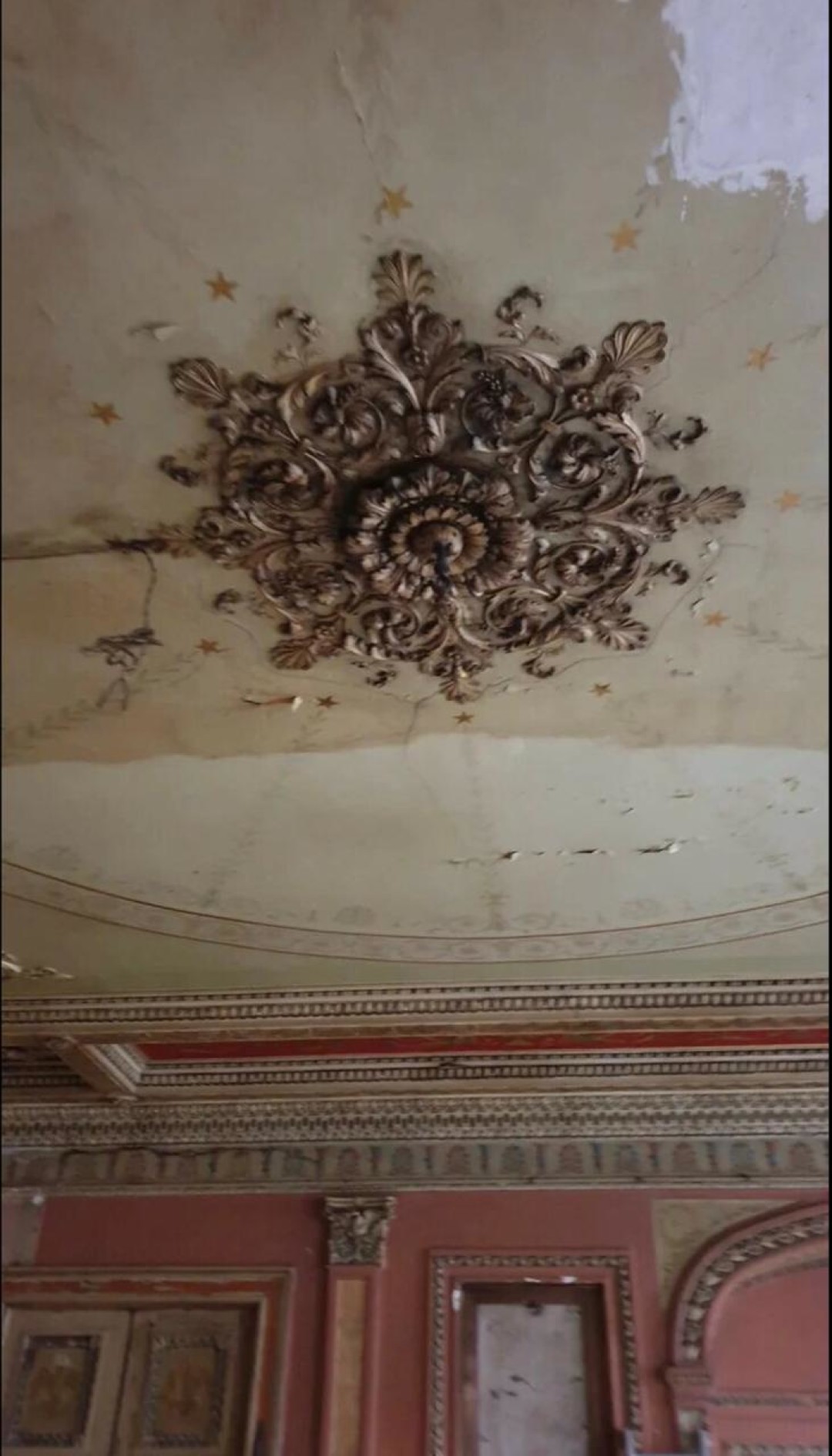 «В 1941 сюда попала бомба, частично отделка утрачена. Раньше тут была коммуналка. Расписной зал был разделен на 3 комнаты — перегородок 7 лет назад Мария не застала, только черные следы. Известно, что тут жили художники. Мария сохранила все печи в помещении, оставила деревянные рамы, очистила фурнитуру, собирается делать открытую проводку. Итого: арендатор в не памятнике делает ремонт за свой счет с сохранением 80% интерьера. Заменила дверь на пластик (плохо), закрасила потолок. Остальное сохранит. Есть повод писать, что ее надо убить? Сомневаюсь», — пишет о ситуации Ксения Сидорина.