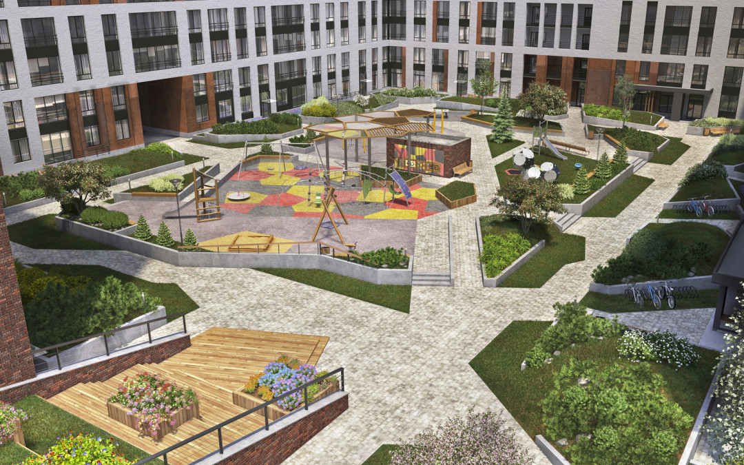При проектировании архитекторы квартала продумали комфортное зонирование. Пространство ЦДС «Черная Речка» делится на разные составляющие: улица и двор, внешнее и внутреннее. Общаться с жителями комплекса можно на внутренней улице квартала, при этом в приватной зоне двора всегда будет спокойно и тихо. Для отдыха устроили террасы в виде небольших амфитеатров, а для атмосферы во внутренних дворах использовали больше рельефа и зелени, а также разноуровневую подсветку.