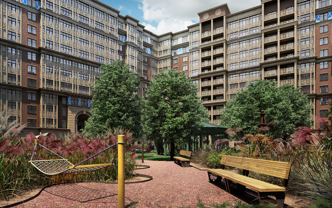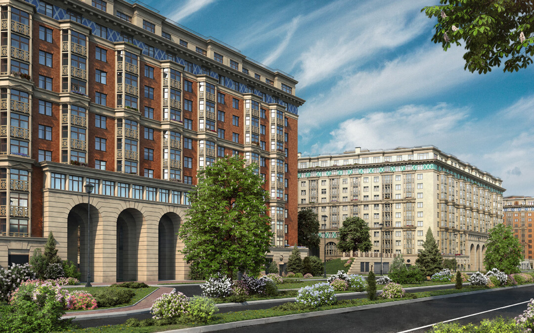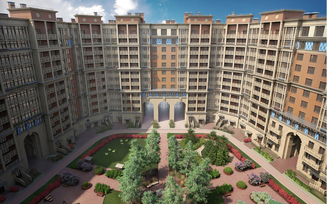 Три пятигранных 12-этажных здания комплекса Ariósto! цитируют шедевр эпохи Ренессанса — укрепленную виллу кардинала Фарнезе в Капрароле под Римом (палаццо был поставлен на пятиугольный каменный фундамент). Мощный первый этаж, арки, римские решетки, фасады из красного кирпича и песочного цвета штукатурка — так выглядит итальянская витальность под северным небом. Автор решения архитектор Максим Атаянц выбрал неоклассику из гуманизма: соразмерность здания и человека — золотой стандарт архитектуры, и этот стандарт здесь постарались соблюсти во всем, от декора фасадов до обустройства дворов.