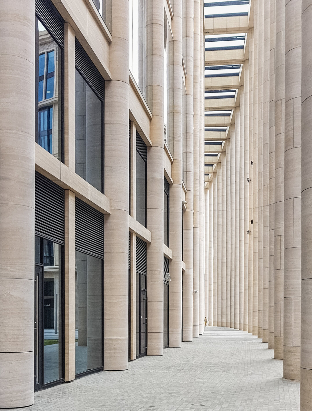 Главный фасад здания, выходящий на Новгородскую улицу, выделяется величественной колоннадой из 16 круглых колонн высотой 30 метров. Его основным облицовочным материалом стал натуральный светлый камень Travertino Romano из Италии – еще одна примета неоклассического стиля. Этот же материал по принципу подобия повторяется на всех корпусах комплекса и дополняется камнями других сортов в каждом здании. Также в неоклассических постройках архитекторы, как правило, стремятся максимально осветить внутреннее пространство, используя разные конструкторские приемы. В случае с «Невской Ратушей» за это отвечают высокие потолки и большая площадь остекления. Стеклянные элементы в сочетании со светлым натуральным камнем колоннад, пилястр, порталов и карнизов красиво смотрятся и днем, и ночью. А прозрачный купол, похожий на летающую тарелку, стал смелым акцентом, создающим интересный контраст с классическими элементами фасада, — но о нем отдельно.