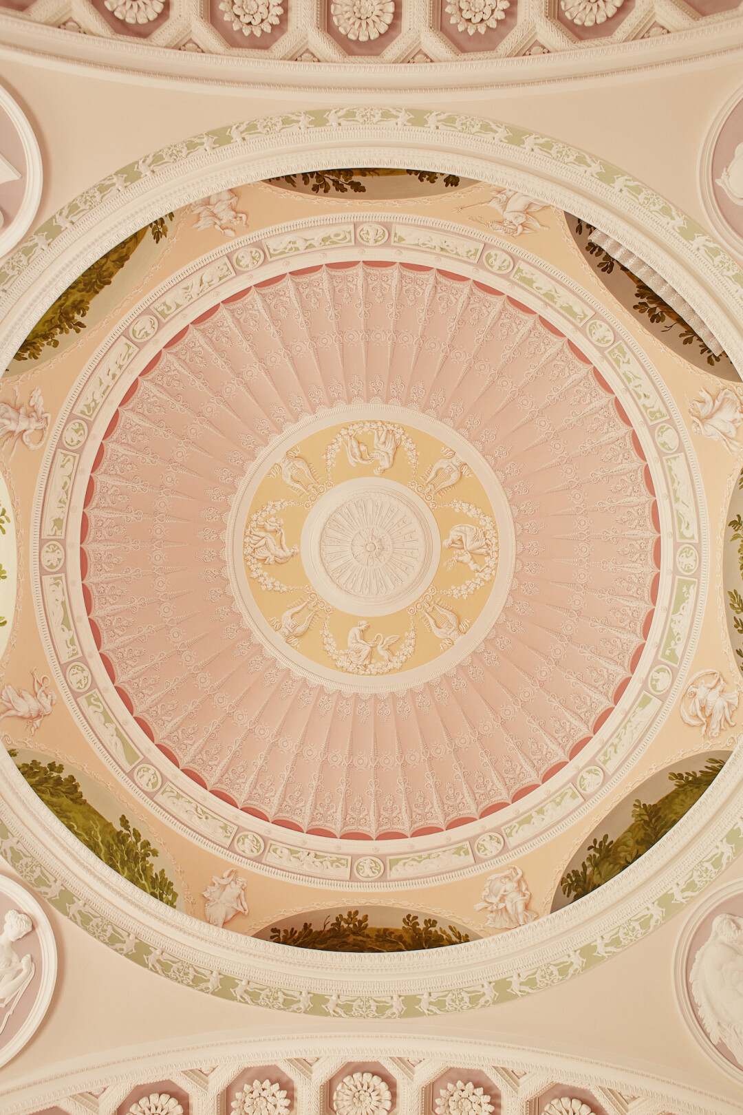 Обычно на стенах делаются ленточные расчистки покраски, и можно увидеть старые оттенки. Но, например, в Купольном зале Зубовского флигеля вся отделка была утрачена во время пожара, поэтому здесь мы применяли аналоги. Нам очень помогли коллеги из французского Института истории искусств: они передали нам оцифрованные копии гравюр Пьетро Санти Бартоли, который перерисовывал в цвете помпейские виллы после проведенных археологических раскопок. Характерные для оформления вилл цветовые сочетания Камерон использовал и в своей работе, и в своих книгах. Ориентируясь на эти палитры и на сохранившиеся в документах описания цветов, мы и подбирали колера стен и купола.