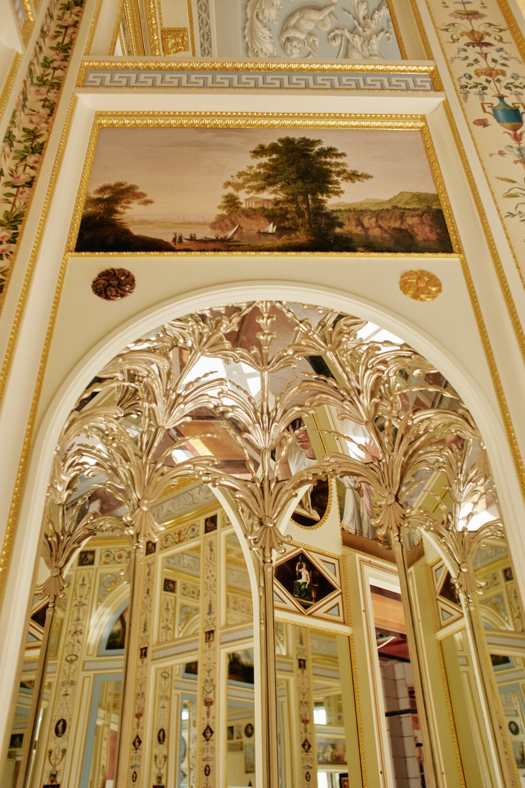 Тем не менее уже через семь лет серебро нещадно потемнело, а из-за тонкости слоя его было невозможно почистить. И тогда уже Джакомо Кваренги переделывает интерьер: вместо серебряных появляются прекрасные расписные пилястры, а серебро остается в зеркальных нишах и на дверях. Посмотрите, сколько здесь различных техник живописи: гризайль, масло, энкаустика, альфрейная роспись по штукатурке, роспись под мрамор…