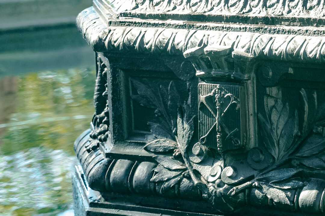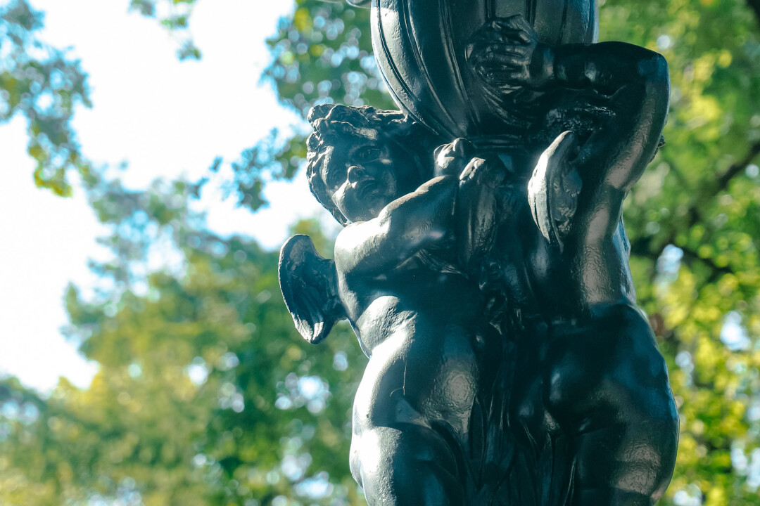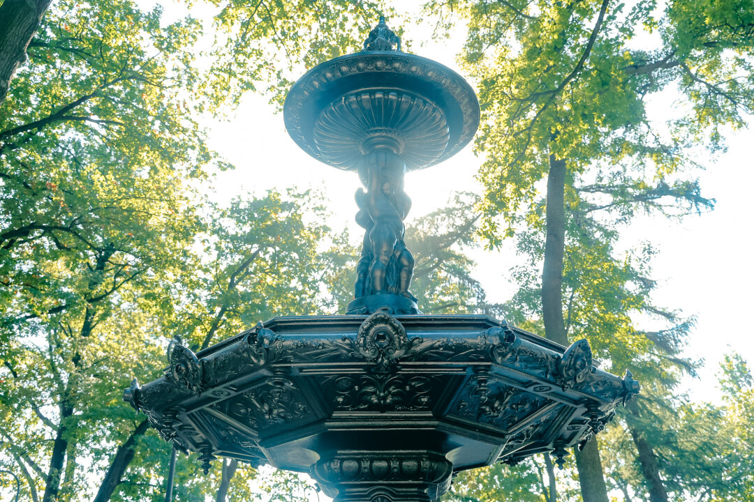 Механизмы и декоративные элементы фонтанов были выполнены в Париже в 1867 году, а в круглых чашах, облицованных гранитом, на восьмигранных чугунных тумбах установлены каменные фигуры путти. Младенцы, символизирующие предвестников земного или ангельского духа, держат над головами небольшие чаши, которые наполняются водой за счет струй, бьющих из львиных голов.