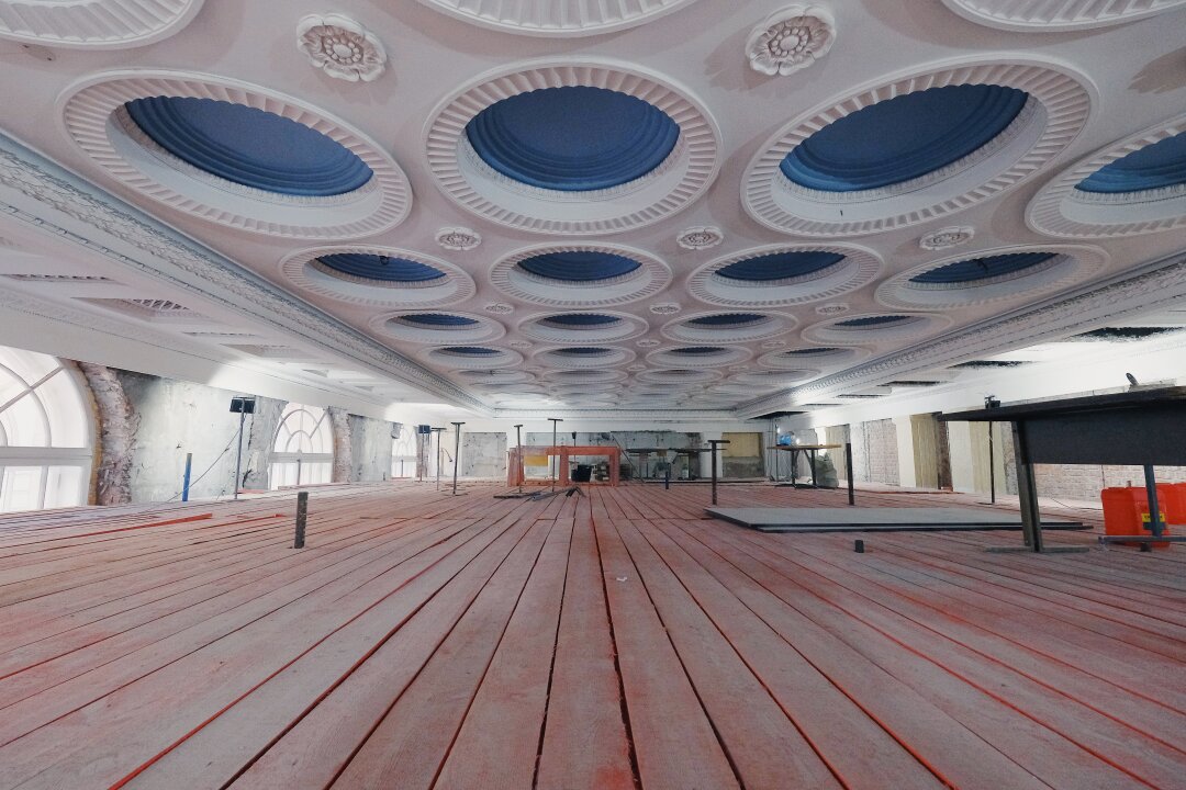 Внутри здания полным ходом ведут строительные работы. Специалисты раскрыли зашитые металлом во время Великой Отечественной войны световые фонари для проверки их состояния, ремонта и восстановления.