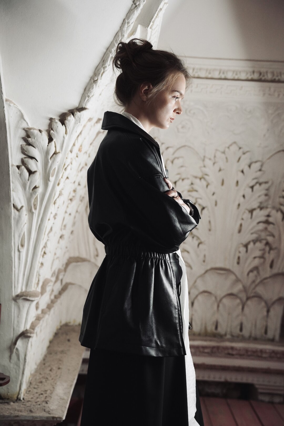 Первый образ. Кожаная куртка Only Me, блуза Tru, верхняя юбка Ushatava, кожаная юбка Brusnika, туфли By Far.