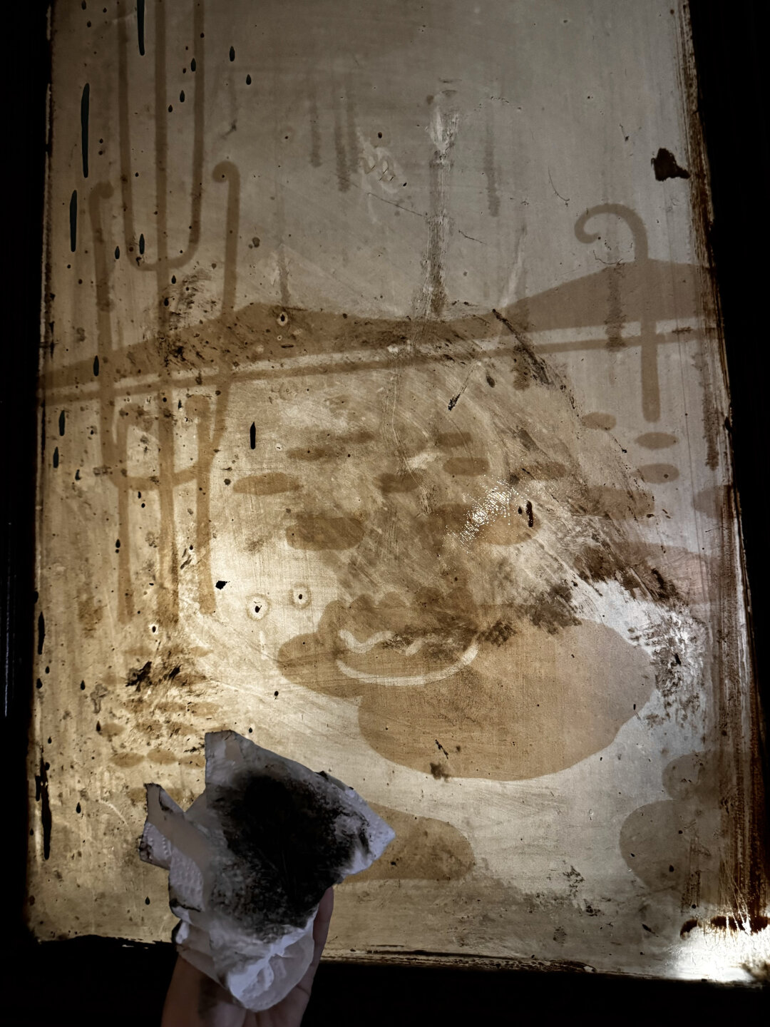В процессе работы мы разбили одно стекло (современное, слава богу). Оно уже стоит в раме, но не вываливается и не рассыпается. Естественно, мы его заменим. Новое стекло уже готово, осталось только смонтировать, чтобы завершить этот проект.