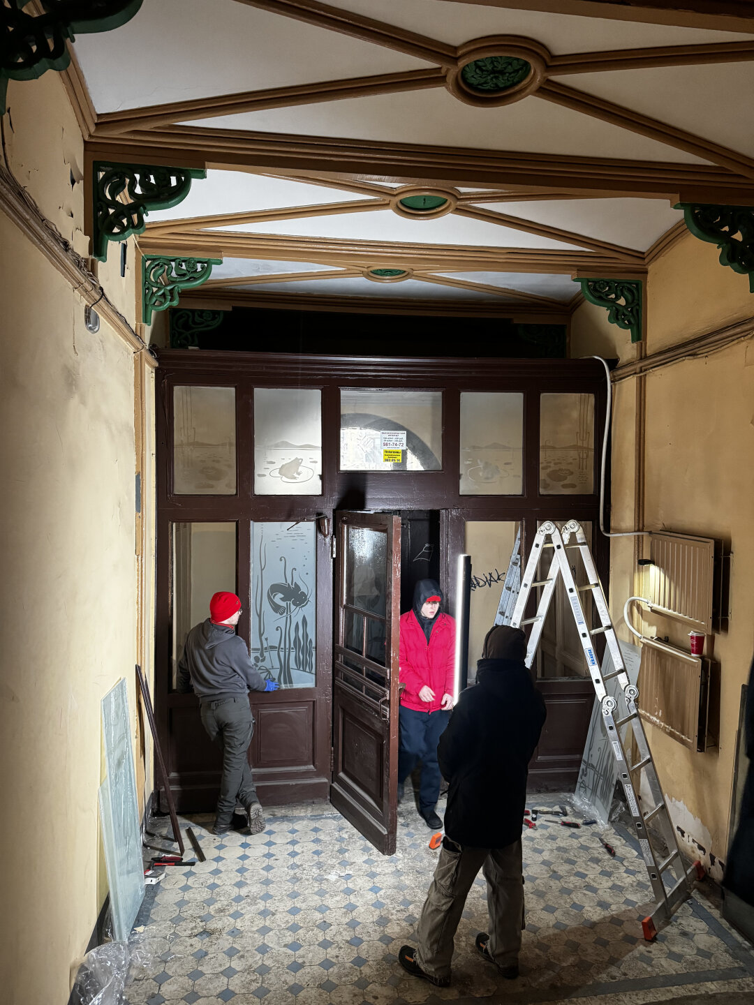 Волонтеры-реставраторы нашли фотографию несохранившегося над центральным входом стекла, сделанную теоретиком архитектуры Борисом Кириковым в 1990-е годы. Дизайнер Юлия Петрова создала макет этой детали, а специалисты мастерской «Императорский стиль» воссоздали ее в своей студии.