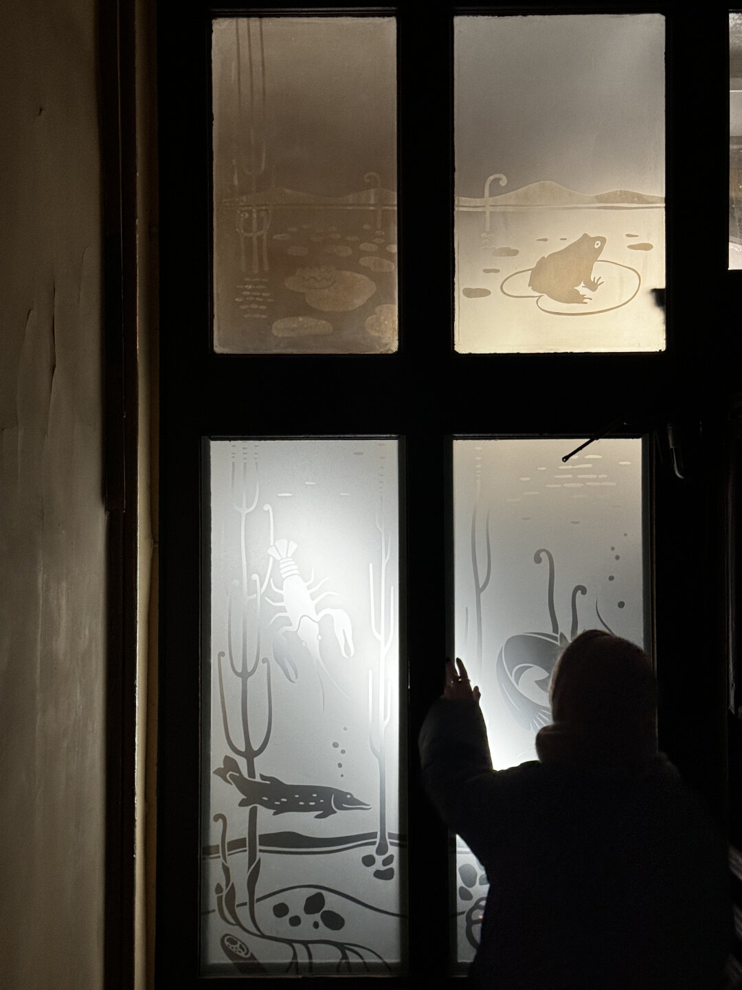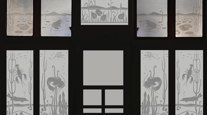 В правой парадной здания сохранился деревянный тамбур со стеклянными вставками 1899 года, украшенными причудливыми рисунками в технике травления. В основе художественной композиции — таинственный пруд: на переднем плане угадываются листья кувшинок с сидящими на них лягушками, а на заднем — невысокие холмы, замыкающие перспективу.