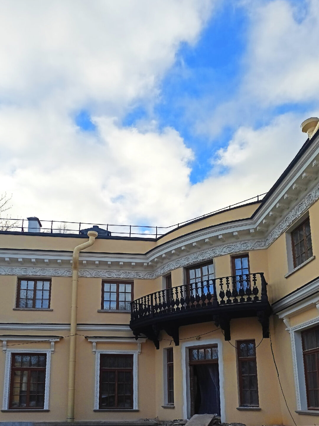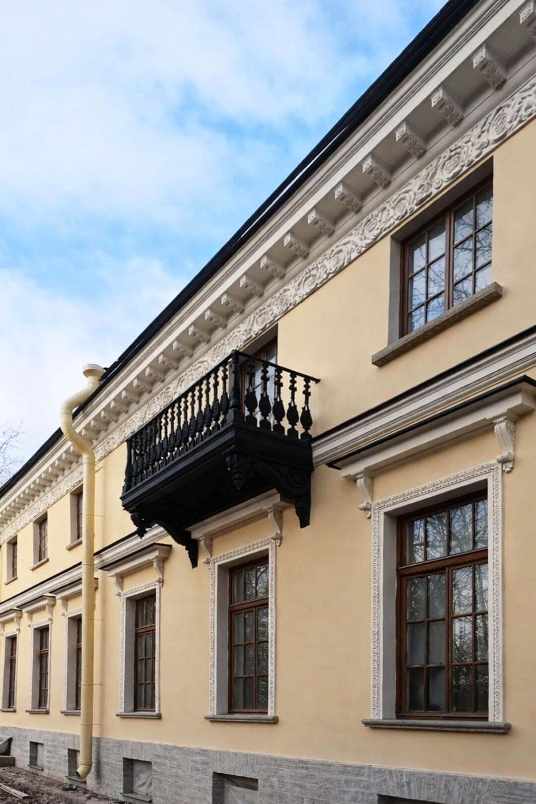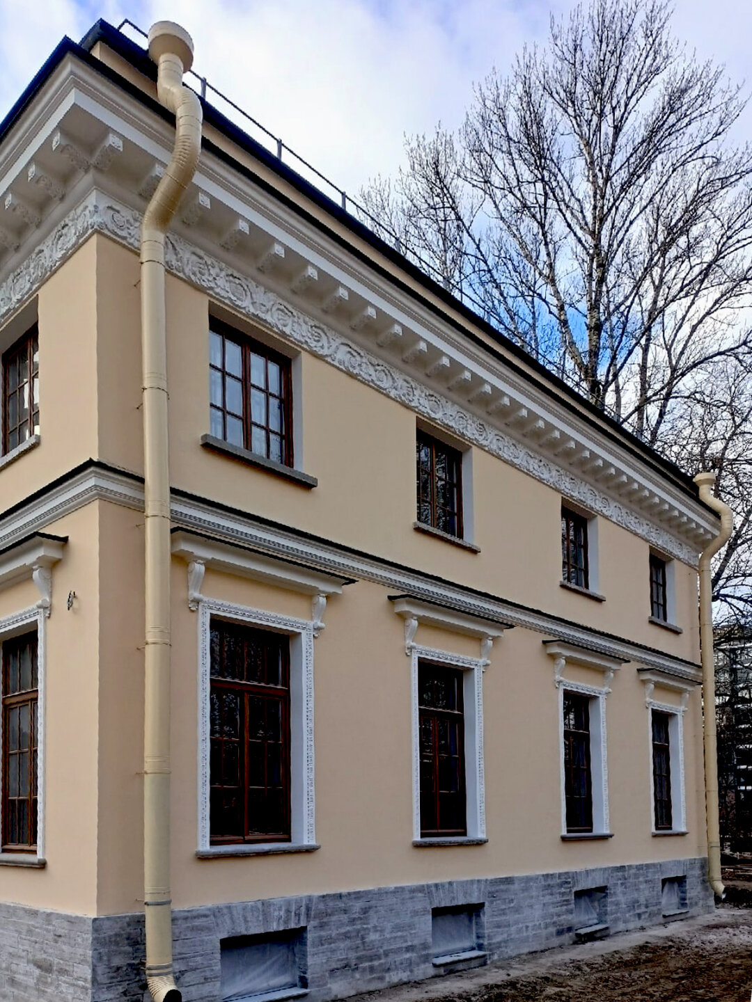 Снаружи главного дома заменили деструктивные кирпичи несущих стен, воссоздали окна и двери из дуба, чугунные ограждения балконов и базы колонн, оштукатурили и окрасили фасады, отреставрировали лепной декор, а также лестницы и цоколь из путиловского известняка.