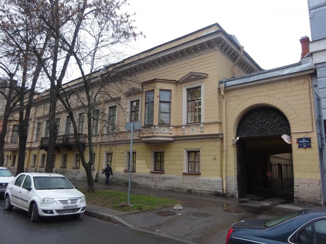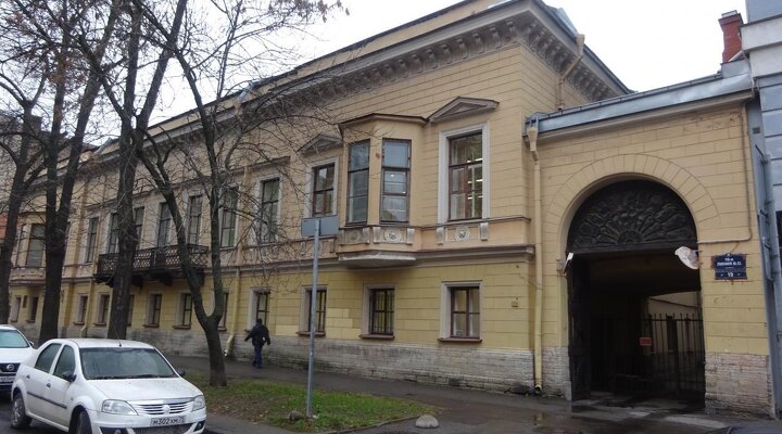 Двухэтажный дом построен в 1840 году по проекту Геральда Боссе. Его стиль относят к переходным — от позднего классицизма к ранней эклектике. В 1911 году дом перестраивали под руководством архитектора Виктора Боброва — тогда со стороны двора появилась одноэтажная пристройка. В 1930-х годах здание занимал техникум речного транспорта.