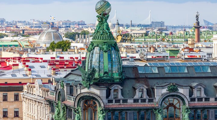 Дом Зингера на углу Невского проспекта и набережной Грибоедова построили в 1904 году по проекту архитектора Павла Сюзора. Визитная карточка здания — выразительная башня-фонарь со стеклянным глобусом, поддерживаемым двумя женскими скульптурами. Этот шар задумывался как рекламный элемент: он подсвечивался изнутри электричеством, а снаружи был опоясан лентой с надписью «Зингер и Ко».