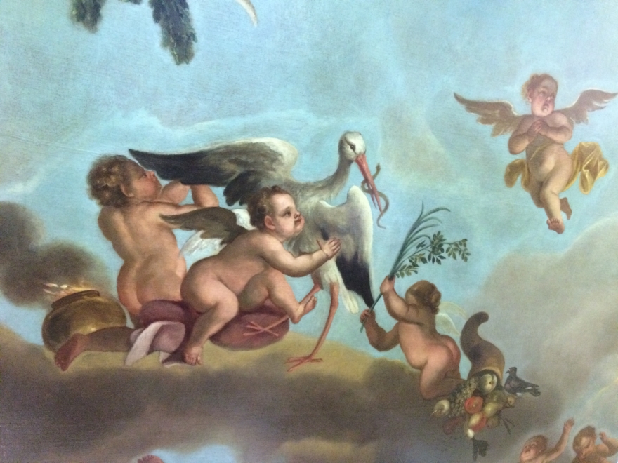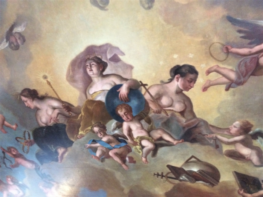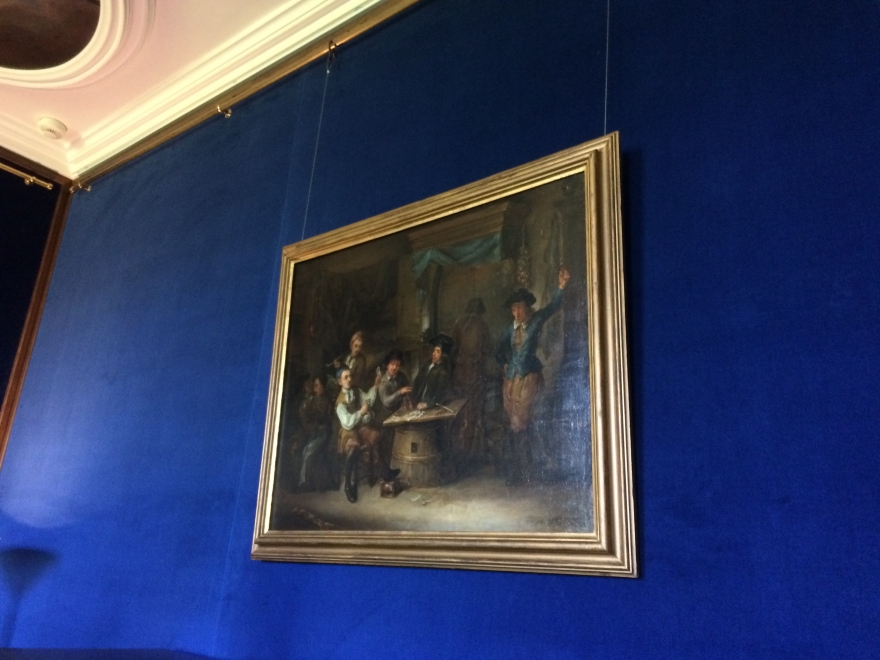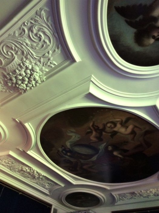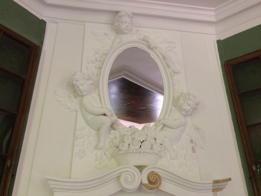 Во второй приемной – невероятно красивый плафон. В XIX веке он назывался «Целомудрие, любовь государя к народу, власть и верность». После реставрации у него появился воздух, светлые оттенки, что позволяет увидеть весь сюжет. Плафон подписной, автором является Георг Гзелль. Большинство его картин написаны по мотивам, которые были модными в то время в Европе. Здесь это «Игра в карты».