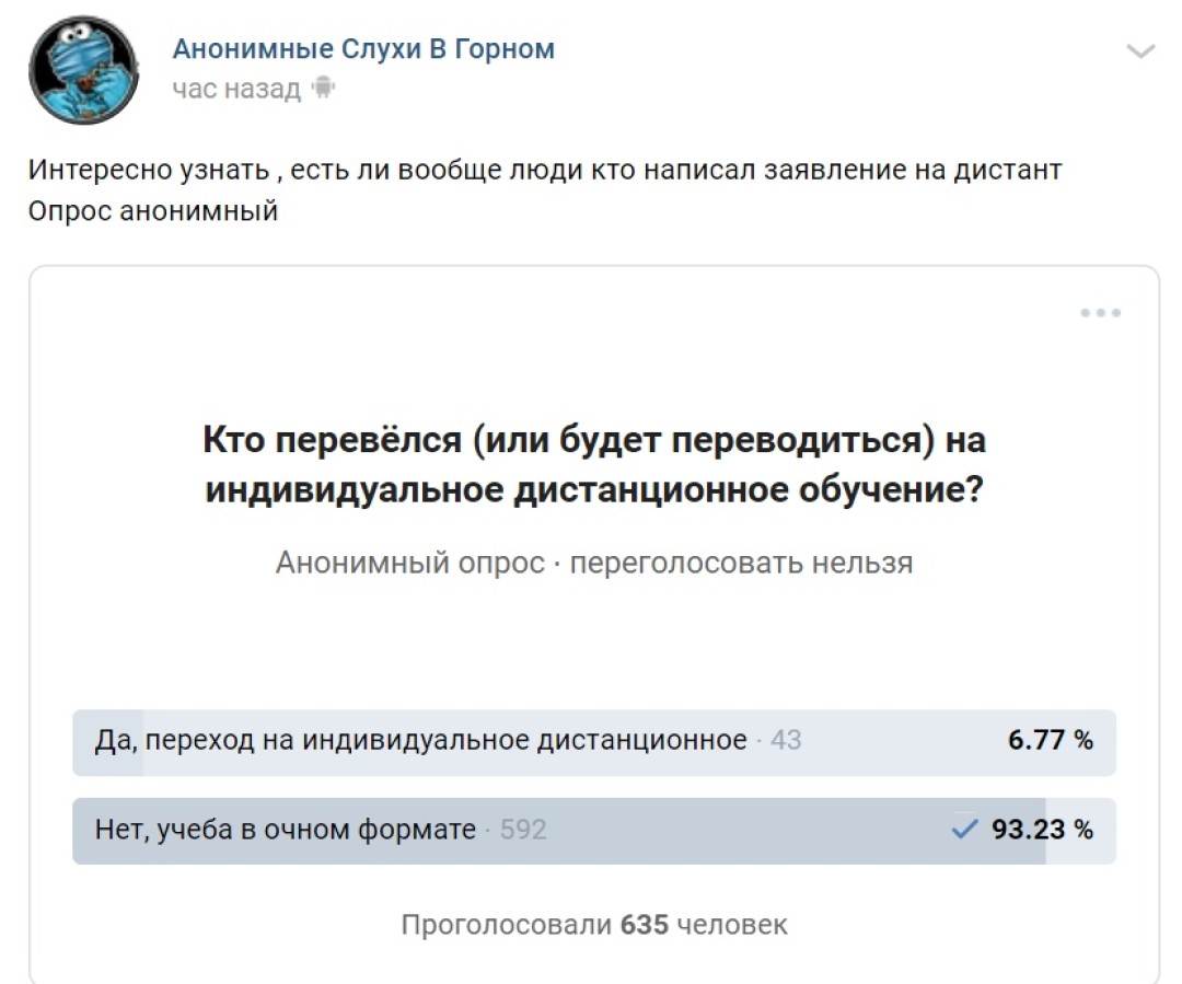 Студенты Горного повсюду просят о помощи: писали письма в Минобрнауки и Беглову, комментарии в официальных группах. В ответ нам предложили только добровольно перейти на дистанционное обучение по индивидуальному учебному плану, но в приложении к диплому будет приписка, что студент не прошел практические занятия.