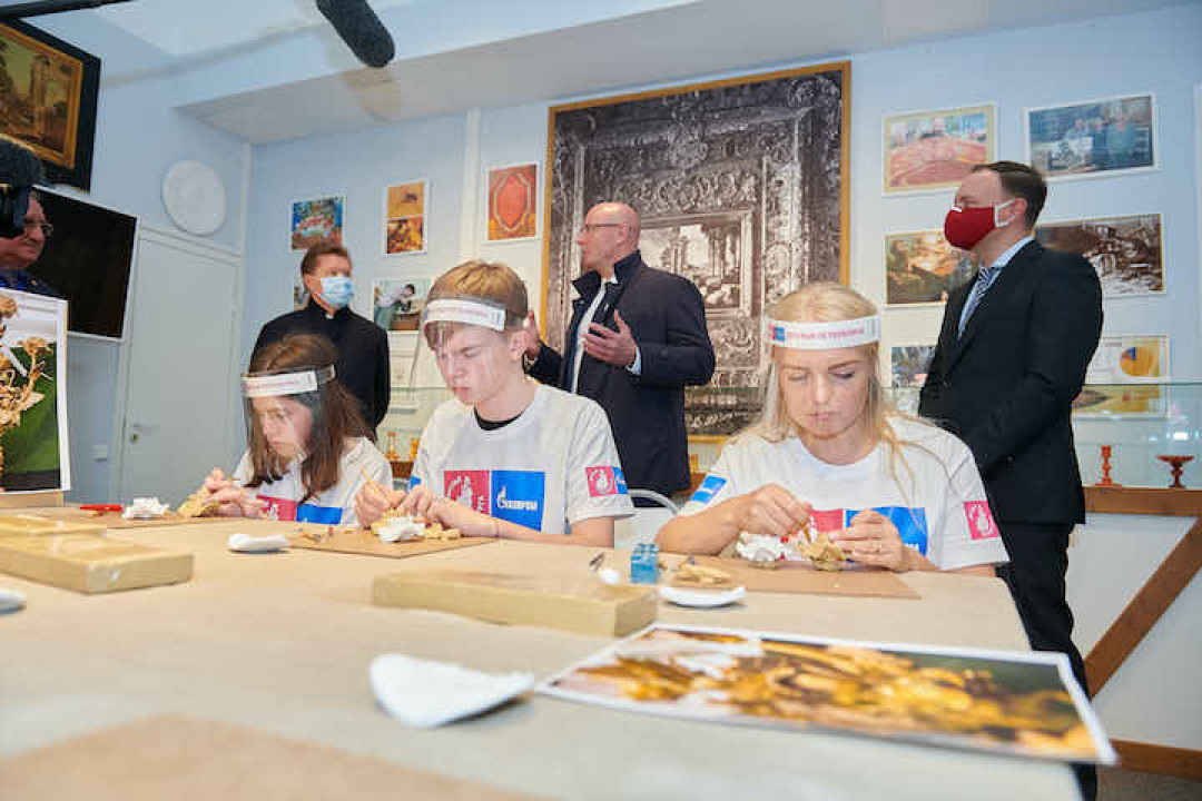 Первый мастер-класс прошел в ГМЗ «Царское Село». В последние годы в музее-заповеднике при поддержке Газпрома один за другим открываются отреставрированные интерьеры Екатерининского дворца. Сегодня уже взят новый реставрационный рубеж –воссоздана парадная анфилада с уникальным барочным решением церкви Воскресения Христова и Лионским залом, пышность убранства которого может соперничать с Янтарной комнатой. Мастер-класс для студентов реставрационных колледжей состоялся на заключительном этапе, когда в Лионском зале еще шли работы над каминами, облицованными русской мозаикой из лазурита. Художники-реставраторы Царскосельской янтарной мастерской показали будущим коллегам, как идет кропотливый процесс воссоздания каминных канделябров. Студенты смогли попробовать себя в настоящем деле, и остались в восторге.