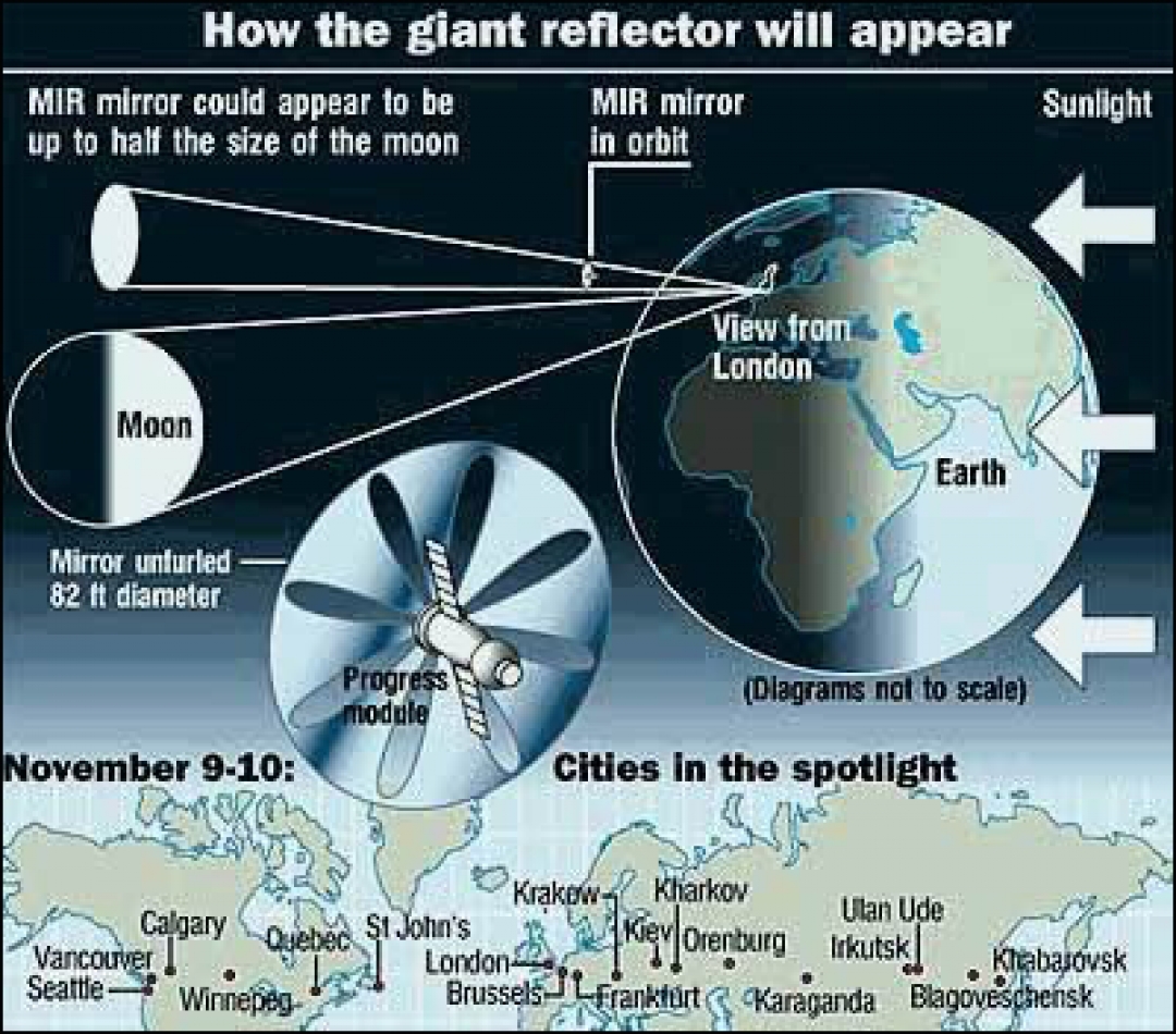 В 1990-е Россия провела серию экспериментов с космическими зеркалами. В рамках проекта «Знамя» 4 февраля 1993 года корабль «Прогресс» успешно развернул отражатель рядом со станцией «Мир». Зеркало создало яркое пятно радиусом 8 километров, которое прошло из южной Франции в западную Россию со скоростью 8 км/с. Отраженный свет действительно имел интенсивность примерно эквивалентную полной Луне. В 1999 году второй запуск оказался неудачным — оболочка зацепилась за антенну, корабль был спущен с орбиты и затоплен в океане, а проект закрыт.
