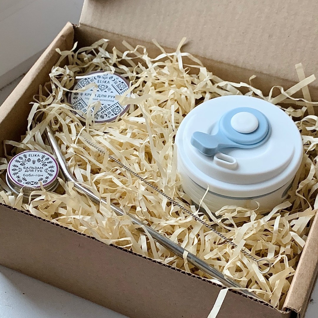 Магазин товаров без упаковки «Покупай правильно» создает наборы на определенную сумму: им можно просто написать, на какую цену вы рассчитываете и кому готовите подарок, а они подскажут, что можно подобрать. В набор можно включить натуральную косметику, тканевые мешочки, многоразовые стаканы и бахилы, шоколад, чай, фруктовые чипсы и елочные игрушки, которые производит сам магазин. Например, в 1 700 обойдется набор, в который входит складной стаканчик для напитков с собой, металлическая трубочка и ершик для нее, крем для рук и бальзам для губ от бренда натуральной косметики Elska.