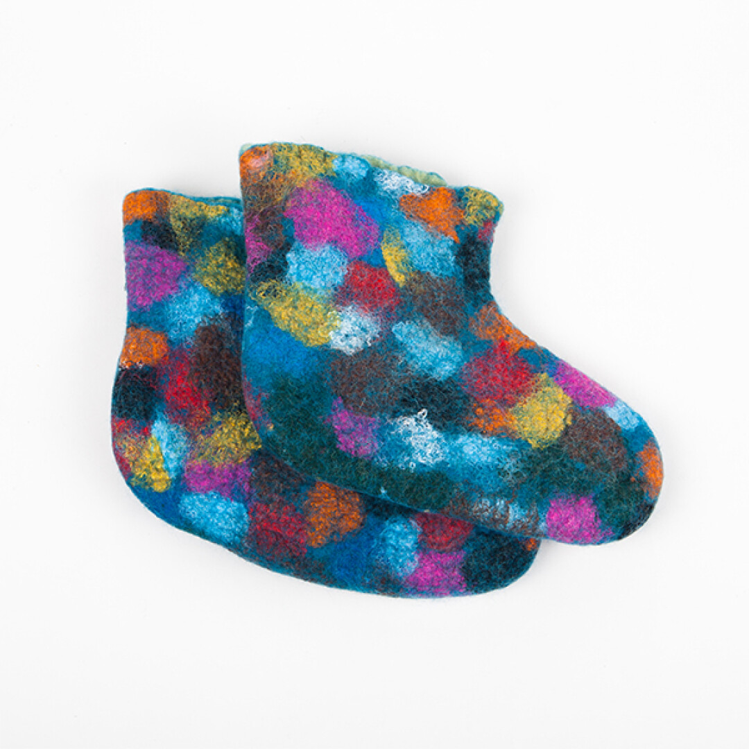 Теплые носки (кажется, отличная альтернатива домашним тапочкам!) сделаны руками людей с инвалидностью в трудовых мастерских «У корней Чуковского». Там ребята занимаются производством изделий из керамики, плетением корзин, изготовлением мыла, свечей и различной сувенирной продукции, а также работают в швейной мастерской.