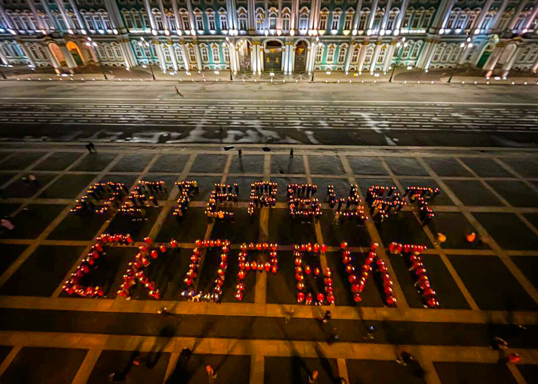 Оказавшись у Эрмитажа около 20:00 в субботу, участники траурного мероприятия зажгли свечи и выстроились таким образом, что при взгляде сверху читалась надпись «Петербург скорбит». «Они звонили в штаб организации и спрашивали, как можно выразить свое отношение к произошедшему в Подмосковье, предлагали различные варианты. Желающих было так много, что пришлось даже ограничить количество участников», — цитирует одного из кураторов движения Александра Амелина пресс-служба Смольного.