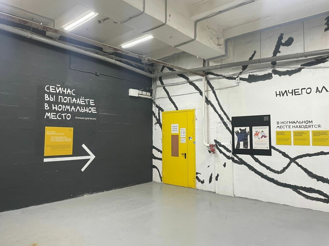 Показ обновленных интерьеров приурочили к 28-летию благотворительной организации «Перспективы», одного из учредителей Нормального места. Теперь подопечные фонда смогут выезжать в Нормальное место из интерната, а их работы и они сами — становиться видимыми для большого количества зрителей. Так, в пространстве лестницы, ведущей в Нормальное место, представлена выставка граффити-работ художников арт-студии благотворительной организации «Перспективы» Миши Фигурина, Даши Абрамовой, Саши Сватковского и Камиля Яппарова.
