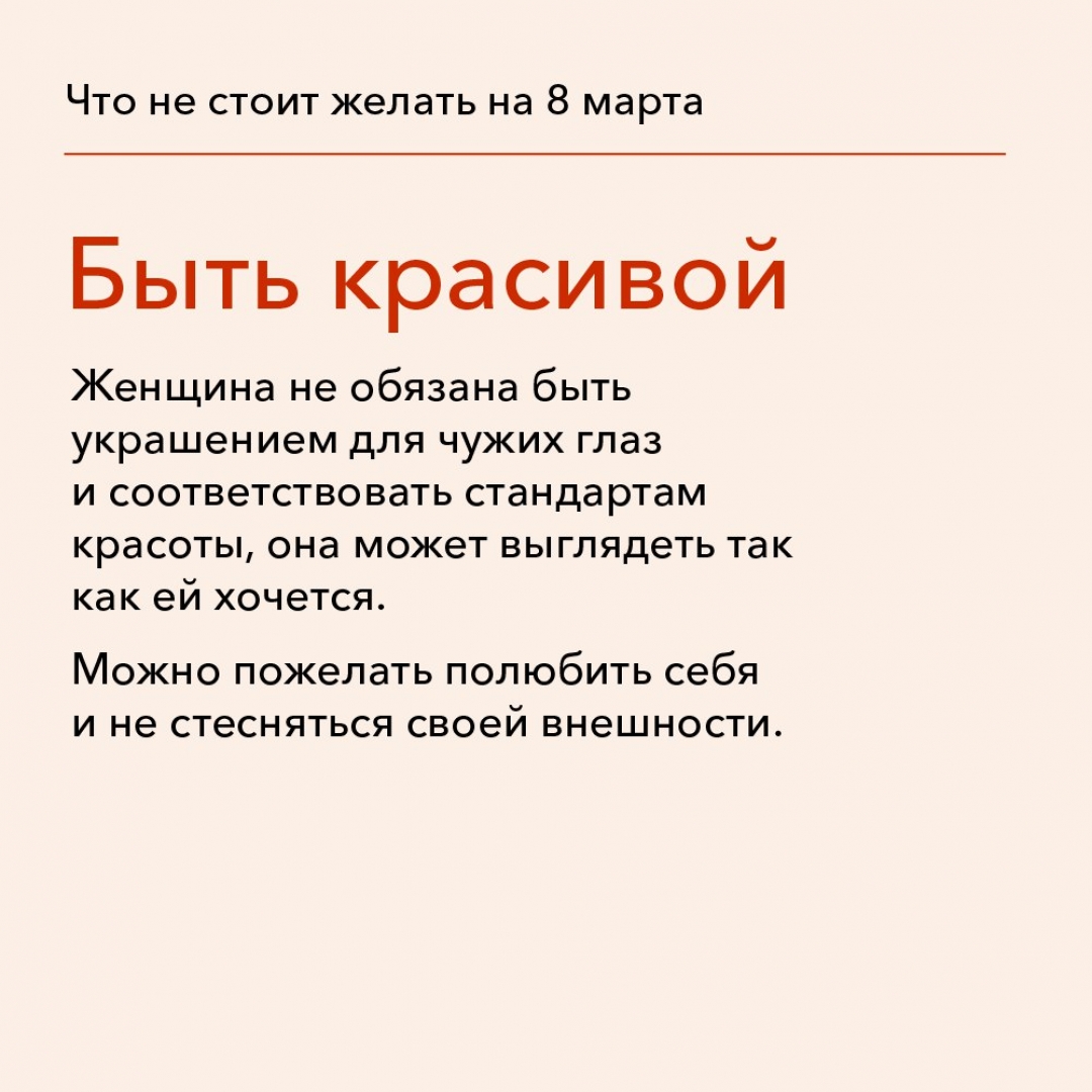 Начать делать карточки было спонтанным решением, у нас с подругами давно было понимание, что мы сходимся в убеждениях. Перед 8 марта кто-то из нас предложил этот формат, друг-дизайнер вызвался помочь. Это был эксперимент, мы не преследовали каких-то определенных целей, просто хотели рассказать о своих взглядах понятным, коротким и визуально привлекательным способом. Пост разошелся, мы были очень рады, что смогли пообщаться с людьми, с которыми бы в обычной жизни не пересеклись. Людям это понравилось, поэтому мы решили продолжать высказываться таким образом по другим поводам. Я читала комментарии, многие женщины писали: «Ну наконец-то кто-то это сказал!». Они признавались, что им тоже надоели эти дурацкие пожелания любви и нежности.