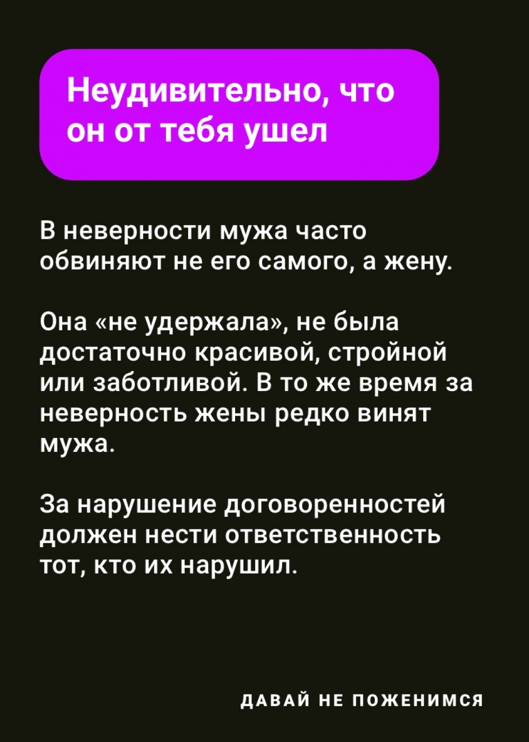 Наша задача не в том, чтобы переубеждать тех, кто пишет «Вам просто надо нормального мужа найти», а в том, чтобы женщины поняли, что они не одни, что проблема не у них в голове – она реально существует, и есть множество людей, которые тоже это видят.