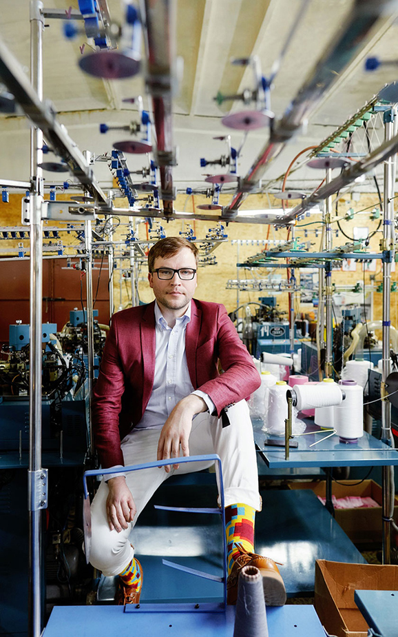 До старта носочного бизнеса я успел попробовать себя во многих сферах, пока не случилось событие, определившее меня сейчас. Я работал на портале «Геометрия» с 2005 года, был главным редактором, потом коммерческим директором, пробовал себя в туристической отрасли, в ресторанной, даже работал в аптеках, где отвечал за маркетинг и параллельно искал, чем заняться. У меня было несколько проектов, которые я разрабатывал для себя. Писал гипотезы, первичные бизнес-планы. Все не то. И вот пятничным утром 1 апреля (без шуток!) я, надевая носки, вдруг понял, что это то, что мне нужно: бизнес на стыке творчества. Через несколько месяцев я нашел бизнес-партнеров и наткнулся на объявление на «Авито» о продаже фабрики в Ленобласти, съездил, пообщался с технологами, и все завертелось. Следующая картинка — осень 2016 года, когда мы выпустили первый пресс-релиз — коллаборацию с московскими дизайнерами: Konstantin Gayday, Daniil Antsiferov, Alexander Arutyunov, Viva Vox. До этого нас никто не знал, а после о нас пошли публикации в Vogue, в The Village, в «Афише», в «Собака.ru». Это дало узнаваемость. Следующий этап — лето 2017 года, когда мы сделали коллекцию с Третьяковской галереей, а носки стали символом музейного маркетинга. Теперь люди хотят носки с искусством России — это класс. В этом году мы начали диверсифицировать бизнес, есть идея домашней одежды и нижнего белья, которые можно сочетать с носками. Думаю, к Новому году у нас будет солд-аут.