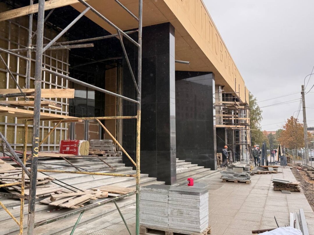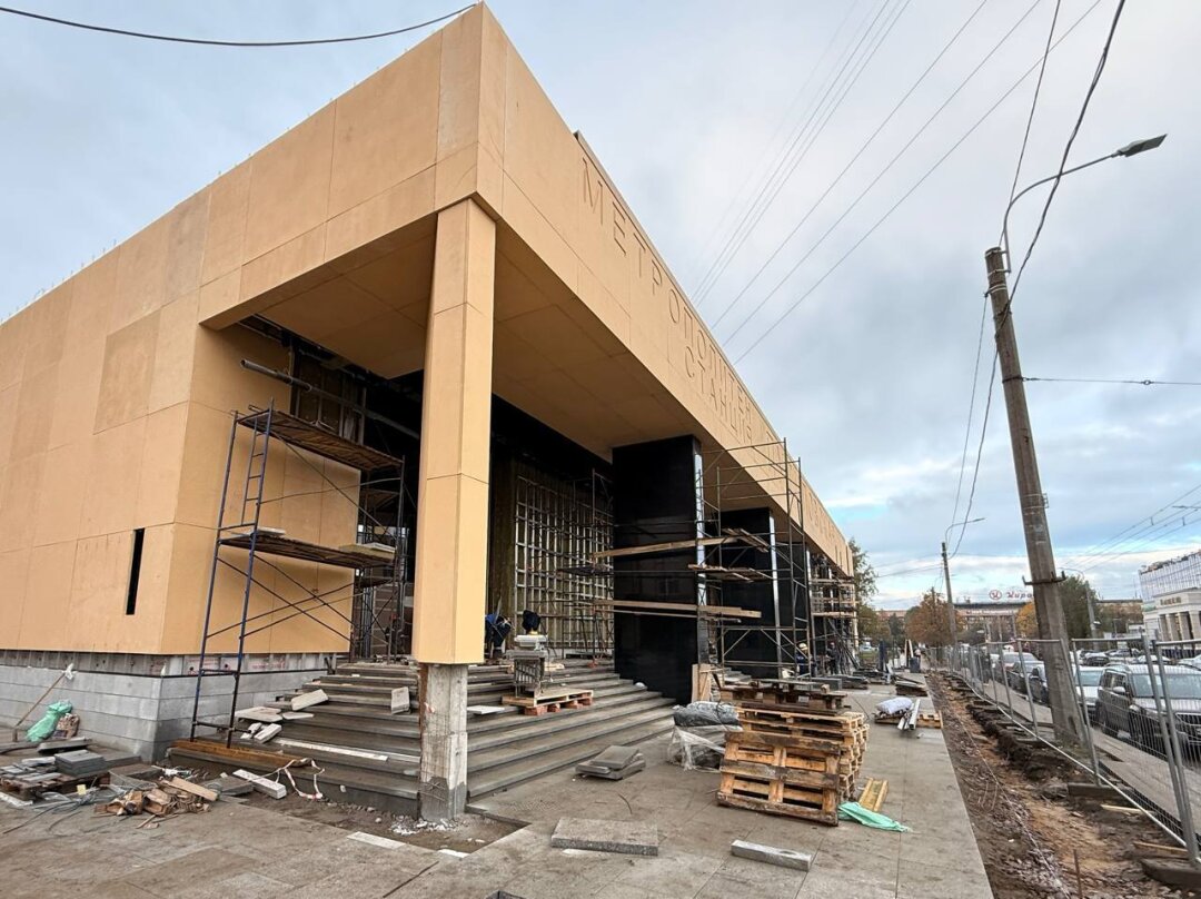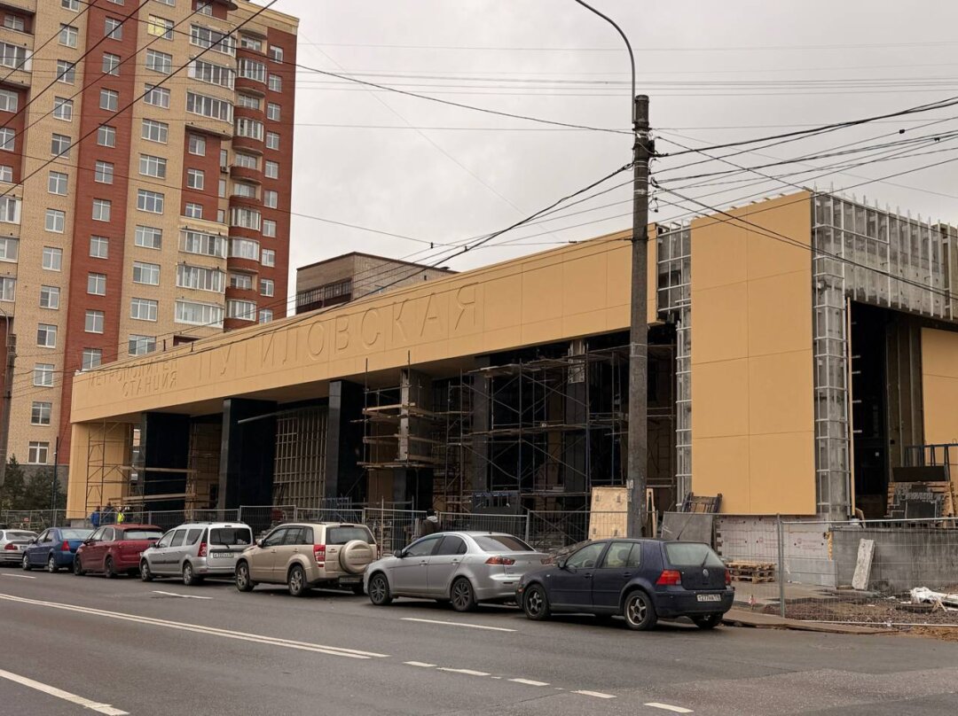 Также на станции монтируется панно над эскалаторным порталом, посвященное Путиловскому (Кировскому) заводу. Продолжается установка вентилируемого фасада.