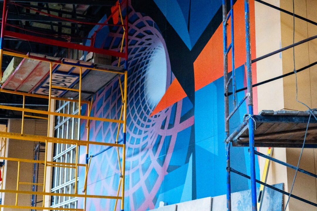 Параллельно ведётся благоустройство территории вокруг вестибюля. Метростроители продолжают отделку потолка, а интерьер станции оформляется в серых и черных тонах, подчеркивающих индустриальный стиль. Контраст с приглушенной гаммой стен создадут большие витражные окна по обеим сторонам зала, наполняющие пространство естественным светом.
