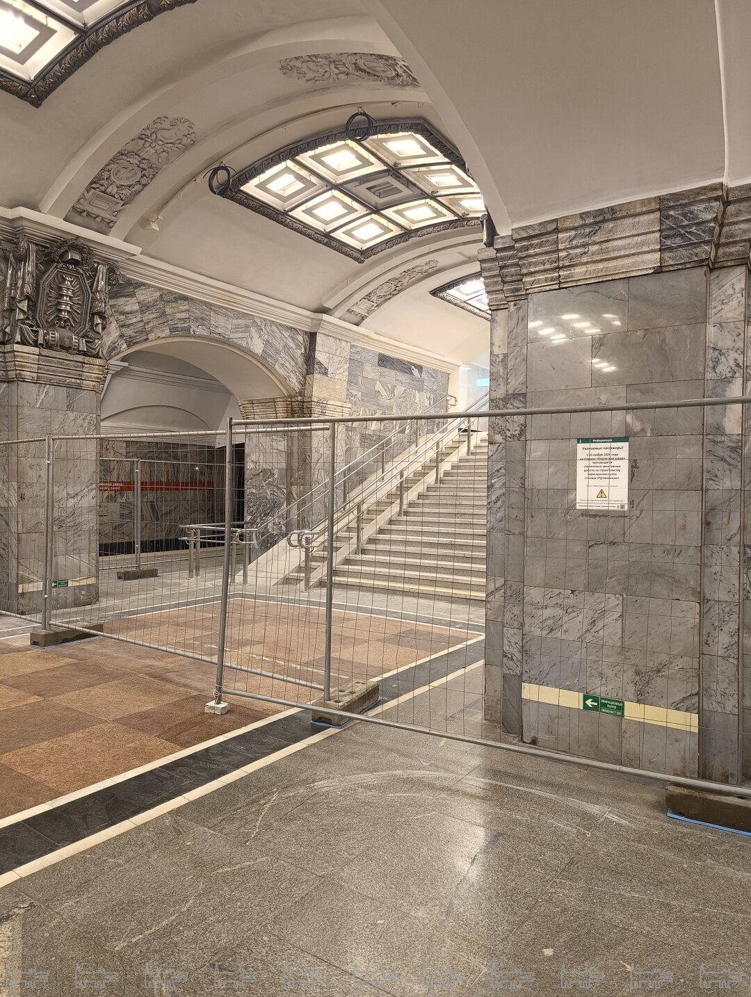 Теперь пассажирам, спускающимся, на станцию «Кировский завод» видна лестница, оборудованная специальными подъемниками для людей, которые не могут самостоятельно подняться по лестнице. Пройтись по ступеням пока нельзя. На ней все еще видны рабочие, проход загорожен редким забором.