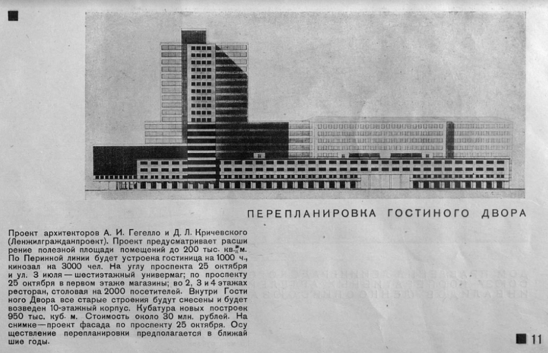 Самый одиозный лист альбома посвящен Гостиному двору на Невском проспекте – в 1932 году он назывался проспектом 25-го Октября. По замыслу архитекторов Александра Гегелло и Давида Кричевского все старые здания в стиле раннего классицизма следовало снести, на их месте поставить 10-ти этажный корпус, по Перинной линии сделать гостиницу на 1 000 человек и кинозал на 3 000 человек. От катастрофы спасло, очевидно, туманное «перепланировка предполагается в ближайшие годы» – они выдались несладкими, и до Гостиного двора руки не дошли. В военное время здание сильно пострадало, но уже в 1945 году прошел конкурс проектов восстановления. Обошлось без высоток. Сегодня оно является памятником федерального значения (как Эрмитаж).