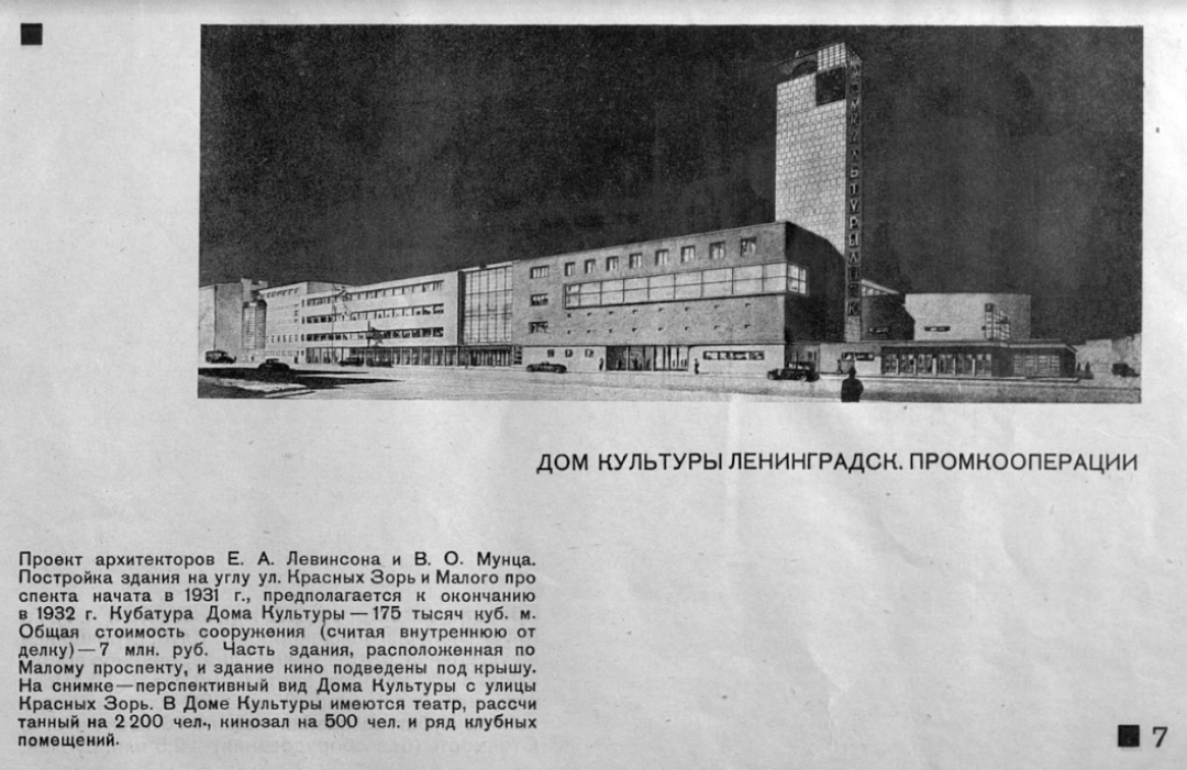 Еще один ДК в списке, начатый в 1931 году, а законченный сильно позднее – в 1938. Улица Красных Зорь – это бывший (и одновременно нынешний) Каменноостровский проспект, а дом под номером 42 сегодня известен нам как ДК имени Ленсовета. До революции здесь располагался «Спортинг Палас» братьев-мукомолов Башкировых, построенный архитекторами Сергеем Гингером и Андреем Белогрудом. В нем находились ресторан, концертный зал, крупнейший в городе кинотеатр и зал для катания на роликовых коньках – «скейтинг ринг» – здание могло одновременно вместить до 8 000 человек. Частично «Спортинг Палас» был включен в ДК имени Ленсовета, частично не сохранился.
