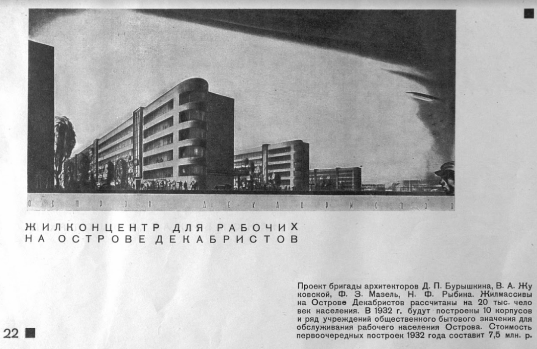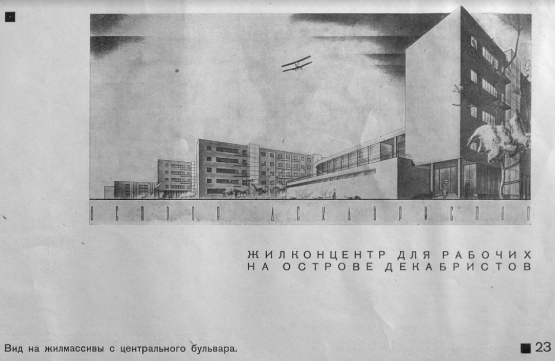 Масштабному проекту целой бригады архитекторов не суждено было осуществиться. А жаль – остров Декабристов (это за Васильевским, почти край Петербурга) еще с дореволюционных времен привлекал архитекторов-монументалистов, умевших мыслить стратегически. Так, в 1910 году здесь началась работа над целым комплексом построек, названных «Новый Петербург». Кроме того, планировалось проложить три новых улицы – три прямых луча. В работе над проектом приняли участие многие архитекторы: от мастера модерна Федора Лидваля до гения неоклассики Ивана Фомина. С 1910 года тут постоянно что-то происходило: строились жилые дома, появилось трамвайное кольцо, проложили проспект КИМа, улицу Каховского, организовали площадь Балтийских Юнг. Формирование района «Нового Петрограда» (так его стали называть с 1914 года) было завершено лишь в 1960-е. Сегодня здесь спокойный зеленый район с креативным пространством Море Place в здании конструкторского бюро «Сигнал», но обещанные в альбомном листе «учреждения общественно бытового значения» жителям (мне, например) очень пригодились бы.