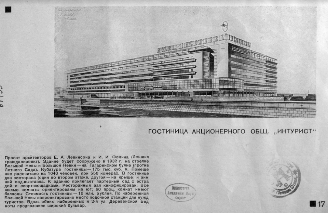 Сегодня гостиницы «Интурист» на стрелке Большой Невы и Большой Невки вы не найдете. Ее действительно начали строить по амбициозному проекту Евгения Левинсона и Игоря Фомина в 1932 году. До 1936 года успели возвести железобетонный каркас до 7 этажа, однако горячие споры вокруг стилистики здания помешали стройке продолжиться. Работы остановили, и в 1938 году было решено переделать гостиницу в жилой дом для Наркомата ВМФ СССР. Это и сделали к 1941 году. Сегодня здание – многоквартирный жилой дом, памятник архитектуры регионального значения.