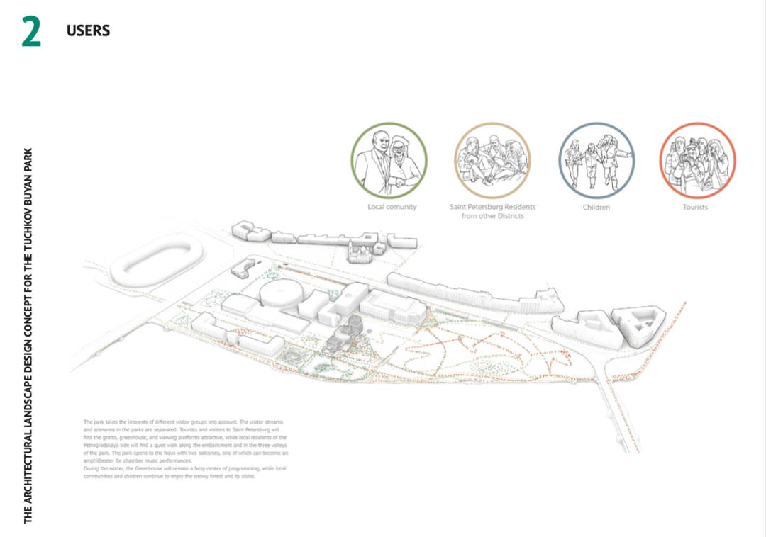 Хотелось бы отметить глубокую проработку аудиторий и сценариев использования территории различными группами. «Студия 44» проанализировала специфику объектов парка и предположила (при помощи специального софта с точностью до 5 метров) их аудиторию (дети, местные, жители других районов города, туристы) в разные сезоны. Ни в одной другой концепции этой теме не был посвящен раздел из четырех разворотов.