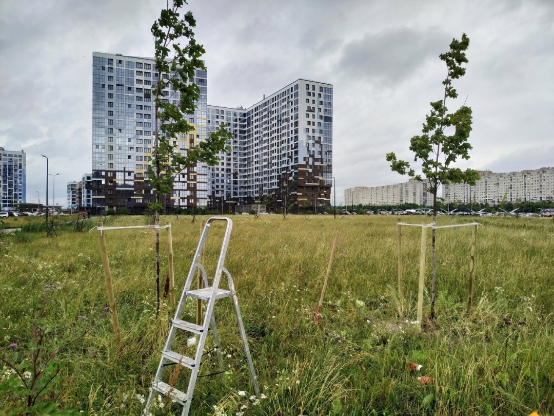Другая сложность — плохая почва. Земля намыва — это песок вперемешку со строительным мусором и завозным грунтом. Но мы договорились с управляющей компанией, чтобы они больше не косили траву — теперь у нас сохраняется экосистема из насекомых и трав. А еще добавляем чернозем. Благодаря такому подходу земля будет становиться лучше с каждым годом. У деревьев парка есть большой шанс выжить, если будем поддерживать эти условия.