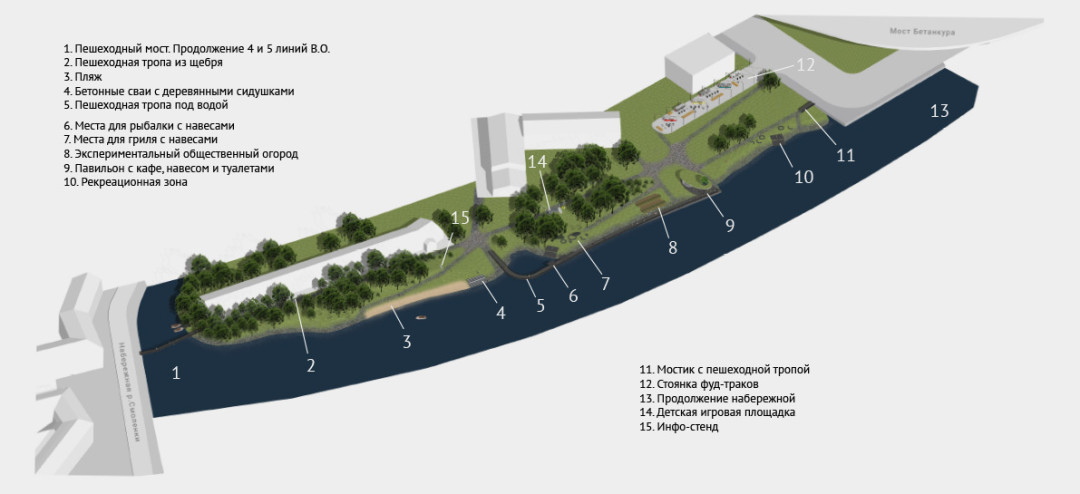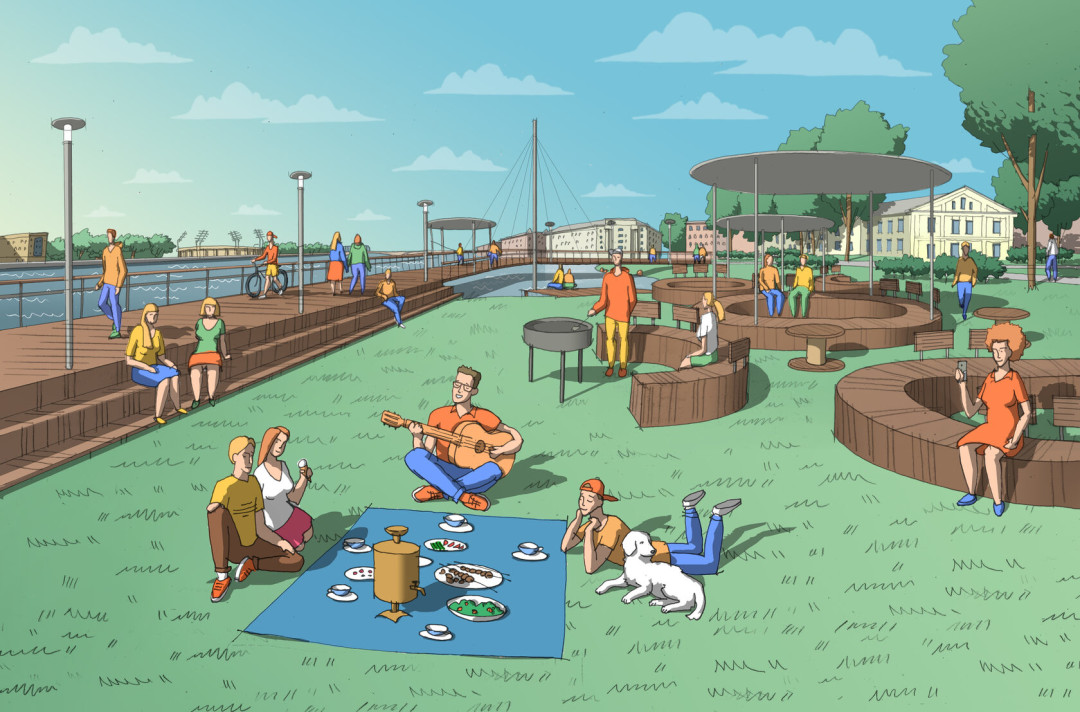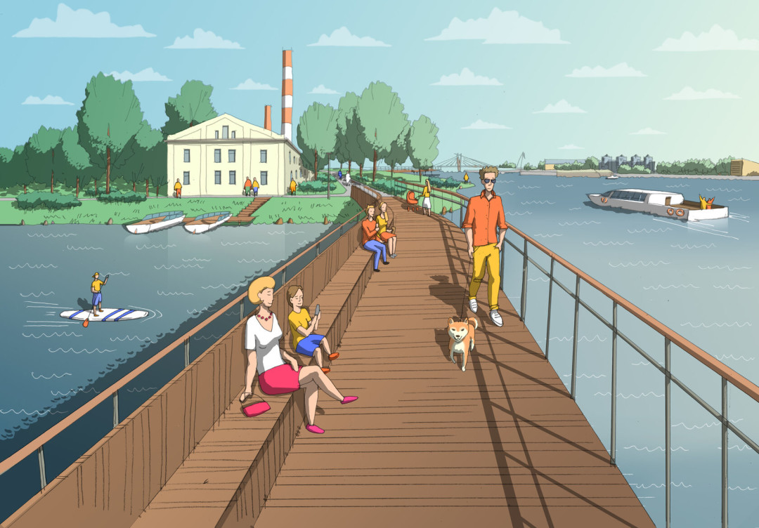 На зоне пустыря мы бы хотели сделать спортивную и детскую площадки, места для гриля, тихого отдыха. Все это можно вписать в существующий ландшафт, потому что там уже есть высокая причальная стенка. Еще есть идея сделать в естественной гавани летний бассейн и зимний каток. Также на визуализации есть мост над водой, на котором люди могли бы рыбачить или просто отдыхать.