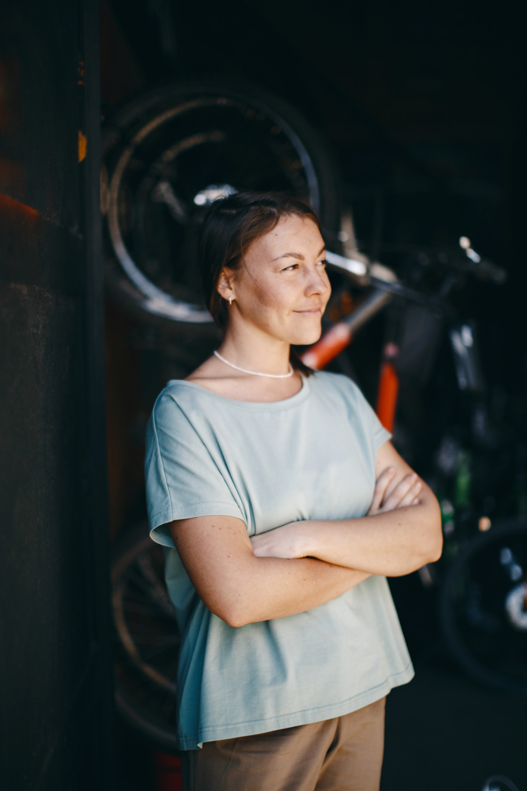 «Я уже больше 10 лет езжу по городу на велосипеде и считаю его отличным городским транспортом. Когда я только начинала работать над своим брендом, было весело ездить по складам фурнитуры, собирая все в корзинку спереди, или везти рулон ткани на плече, руля одной рукой (трюк выполнялся профессионалом, не повторяйте подобное самостоятельно). Петербург — идеальный город для велосипедистов, ровный, без особых перепадов высоты. У меня есть опыт пересечения всего города вдоль и поперек.