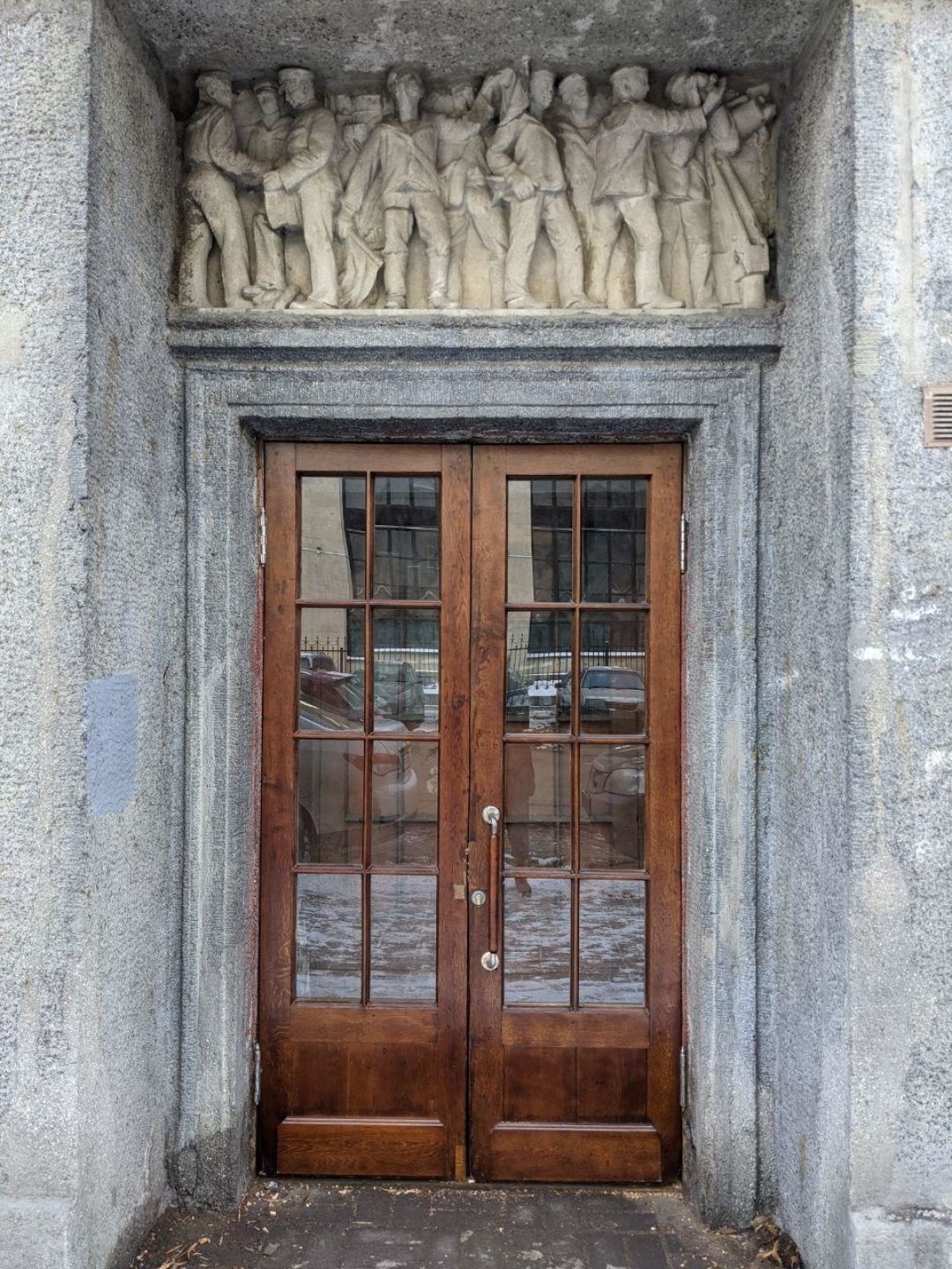 В августе парадную дверь демонтировали. Мастера очистили ее от металлического листа, сняли краску, восстановили фурнитуру, стекла и отбойник по архивным фотографиям. И только в январе этого года установили их обратно. Специалисты сделали хорошую работу по древесине, но фурнитура была восстановлена некачественно. Сейчас мы ищем другого подрядчика, который сможет переделать.
