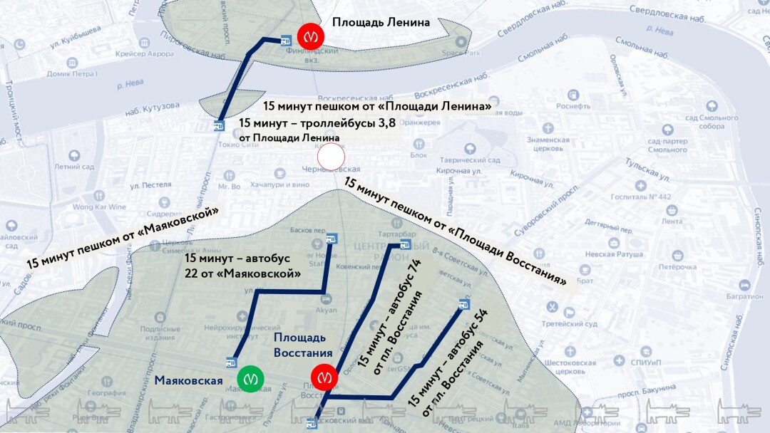 Пока в Петербурге есть проблемы с прерыванием выделенных полос у перекрестков, нарушителями ПДД — из-за чего существующие выделенные полосы могут буксовать. Но в городе эффективно работают встречные выделенные полосы, например, на Малой Морской или Гороховой. По таким же выделенным полосам навстречу движению на улицах Восстания и Маяковского возможно запустить автобусы, обслуживающие пассажиров «Чернышевской». Этот вариант потребует корректировки схем движения на нескольких перекрестках. Если нарушителей ПДД будет меньше, а правые повороты сделают по московскому стандарту с короткими разрывами, можно запустить маршрут и по более простой схеме: например по Лиговскому проспекту и улице Радищева.