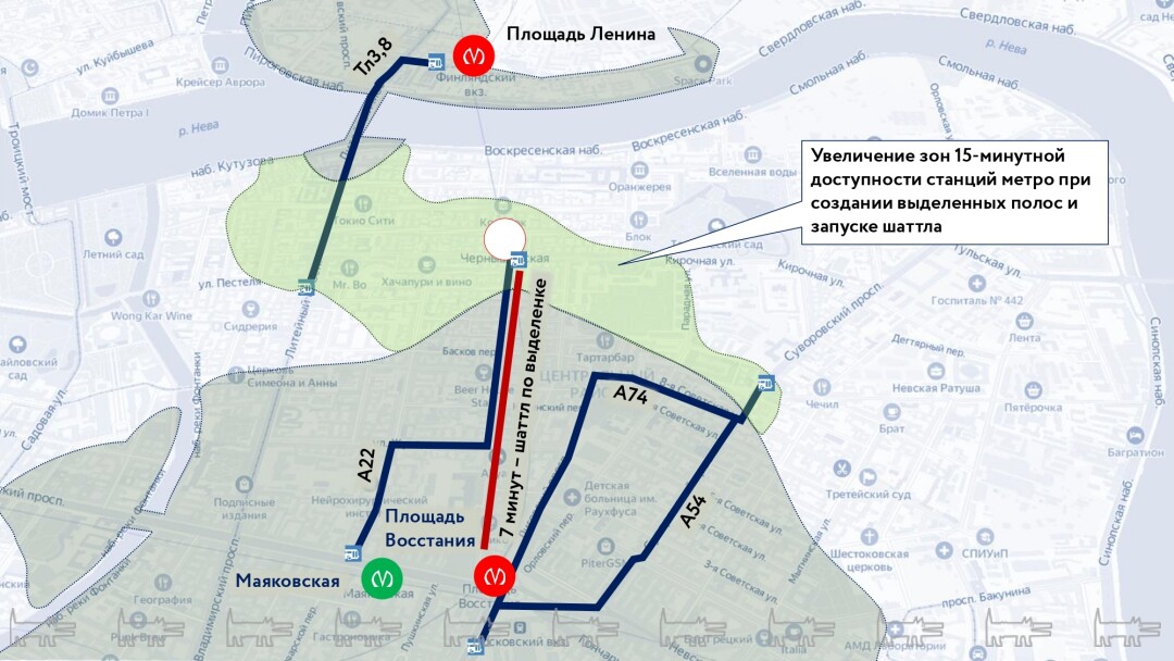 Выделенных полос возле станции «Чернышевская» нет. Их необходимо создать хотя бы для подвоза пассажиров к ближайшим станциям метро: «Площади Восстания», «Маяковской» и «Площади Ленина». Можно запустить шаттл, следующий исключительно по выделенной полосе, а значит — с минимальными интервалами, задержками и максимальной провозной способностью как у метро.
